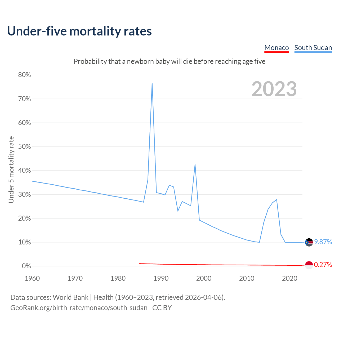 The chance that a newborn baby will die before reaching age five is 0.27% in Monaco and 9.87% in South Sudan. Above is a chart with historical data on under-five mortality rates.