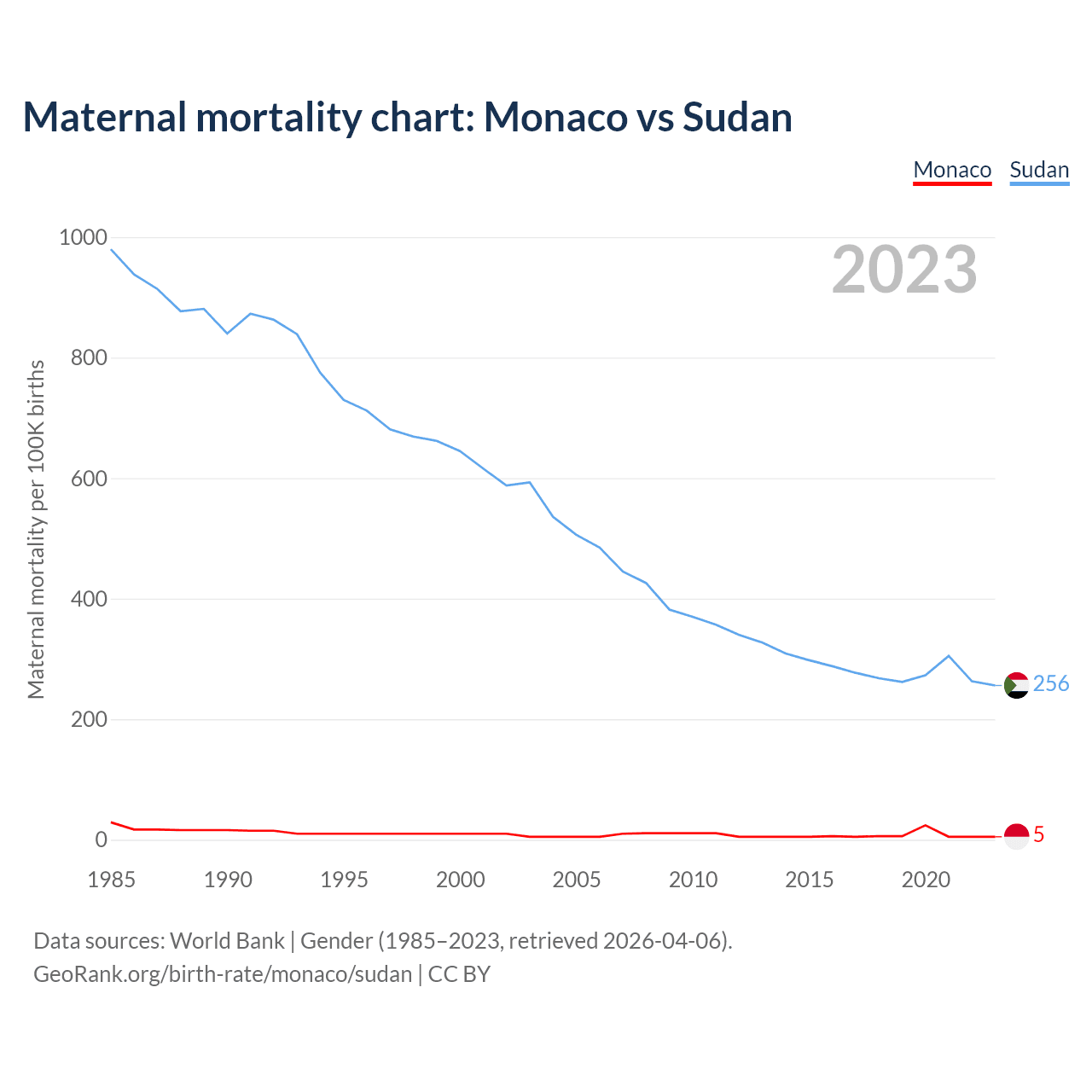 The maternal mortality rate, which is the probability of dying during childbirth or within 42 days of pregnancy termination, is 5 deaths per 100,000 live births in Monaco, compared to 256 deaths in Sudan.