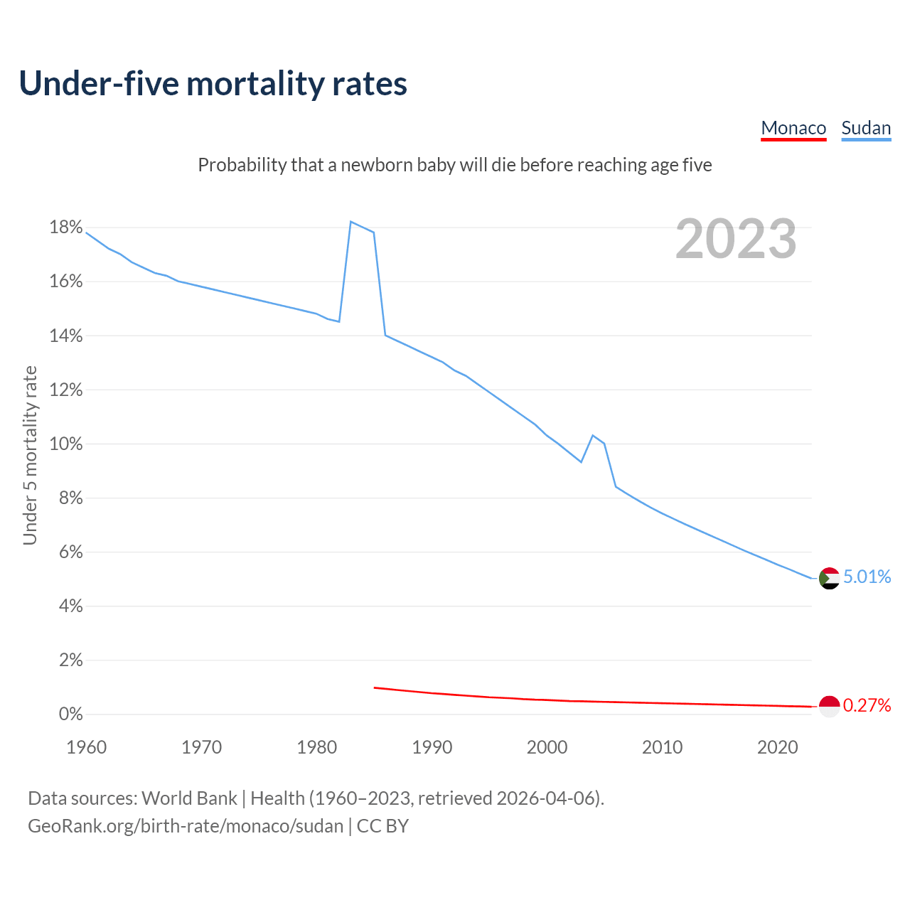 The chance that a newborn baby will die before reaching age five is 0.27% in Monaco and 5.01% in Sudan. Above is a chart with historical data on under-five mortality rates.