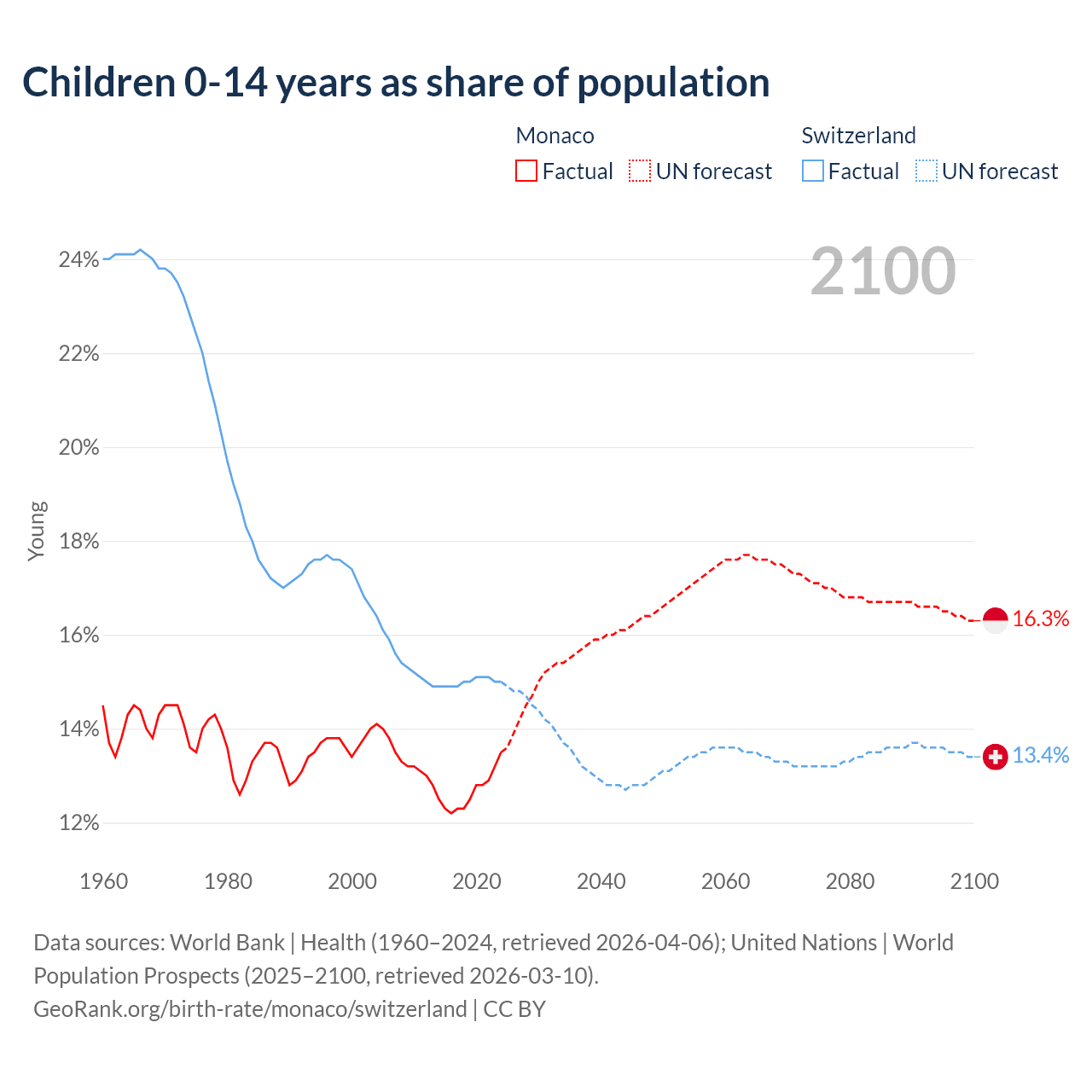 Monaco has an annual birth rate of 9.44 births per 1,000 people, compared to 9 for Switzerland. The average number of children a woman is expected to have during her lifetime — the fertility rate, is 2.11 in Monaco and 1.33 in Switzerland — 37% difference.