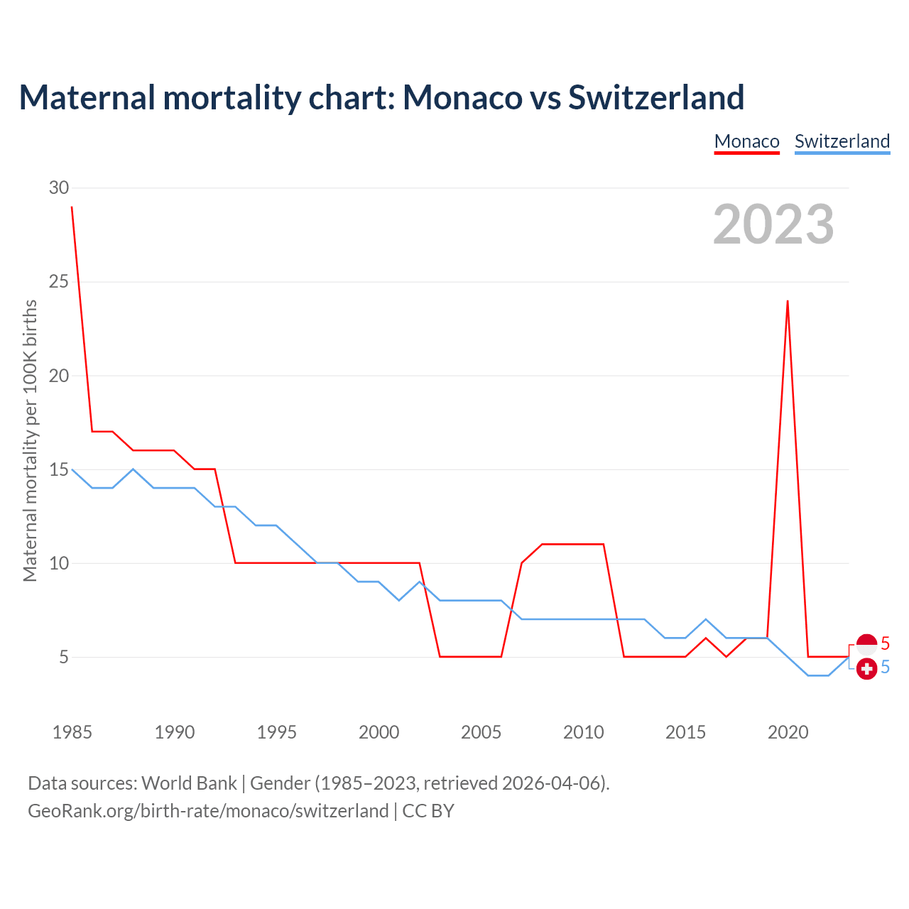 The maternal mortality rate, which is the probability of dying during childbirth or within 42 days of pregnancy termination, is 5 deaths per 100,000 live births in Monaco, compared to 5 deaths in Switzerland.