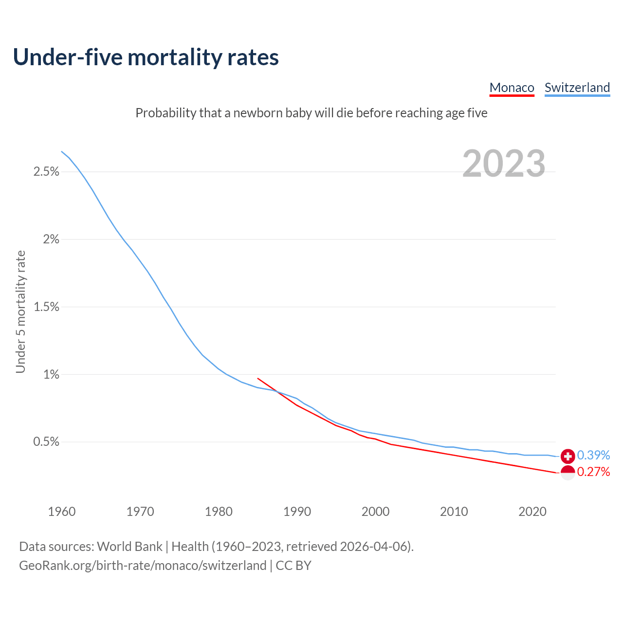 The chance that a newborn baby will die before reaching age five is 0.27% in Monaco and 0.39% in Switzerland. Above is a chart with historical data on under-five mortality rates.