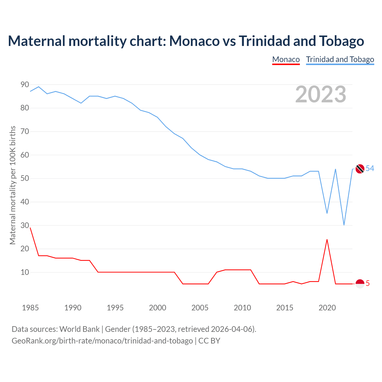 The maternal mortality rate, which is the probability of dying during childbirth or within 42 days of pregnancy termination, is 5 deaths per 100,000 live births in Monaco, compared to 54 deaths in Trinidad and Tobago.