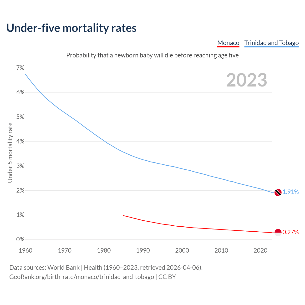 The chance that a newborn baby will die before reaching age five is 0.27% in Monaco and 1.91% in Trinidad and Tobago. Above is a chart with historical data on under-five mortality rates.