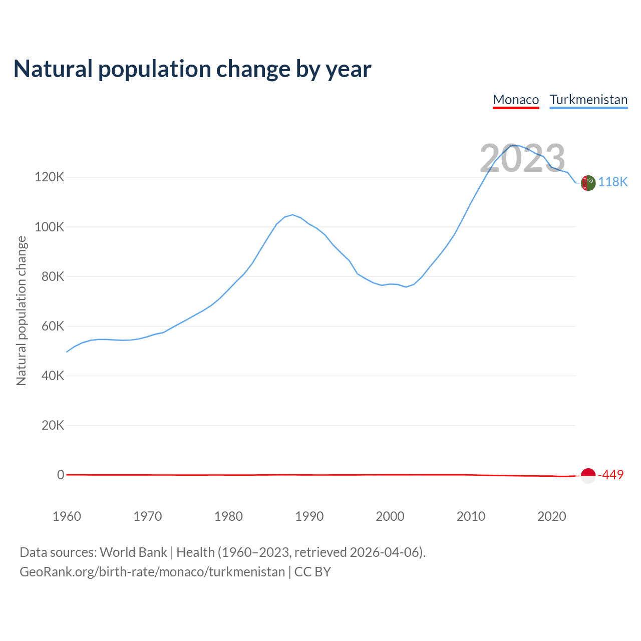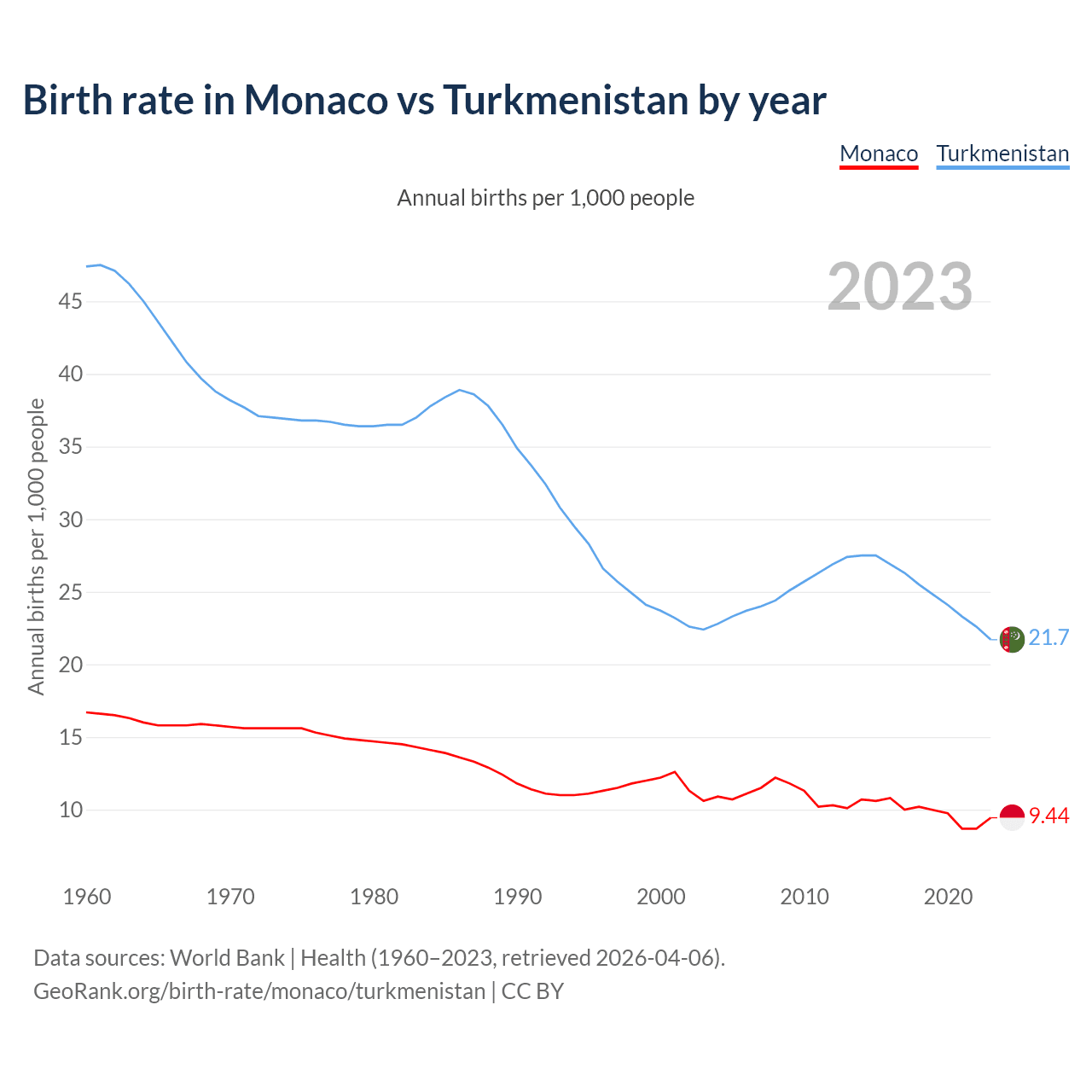Monaco has an annual birth rate of 9.44 births per 1,000 people, compared to 21.7 for Turkmenistan. The average number of children a woman is expected to have during her lifetime — the fertility rate, is 2.11 in Monaco and 2.69 in Turkmenistan — 27.5% difference.