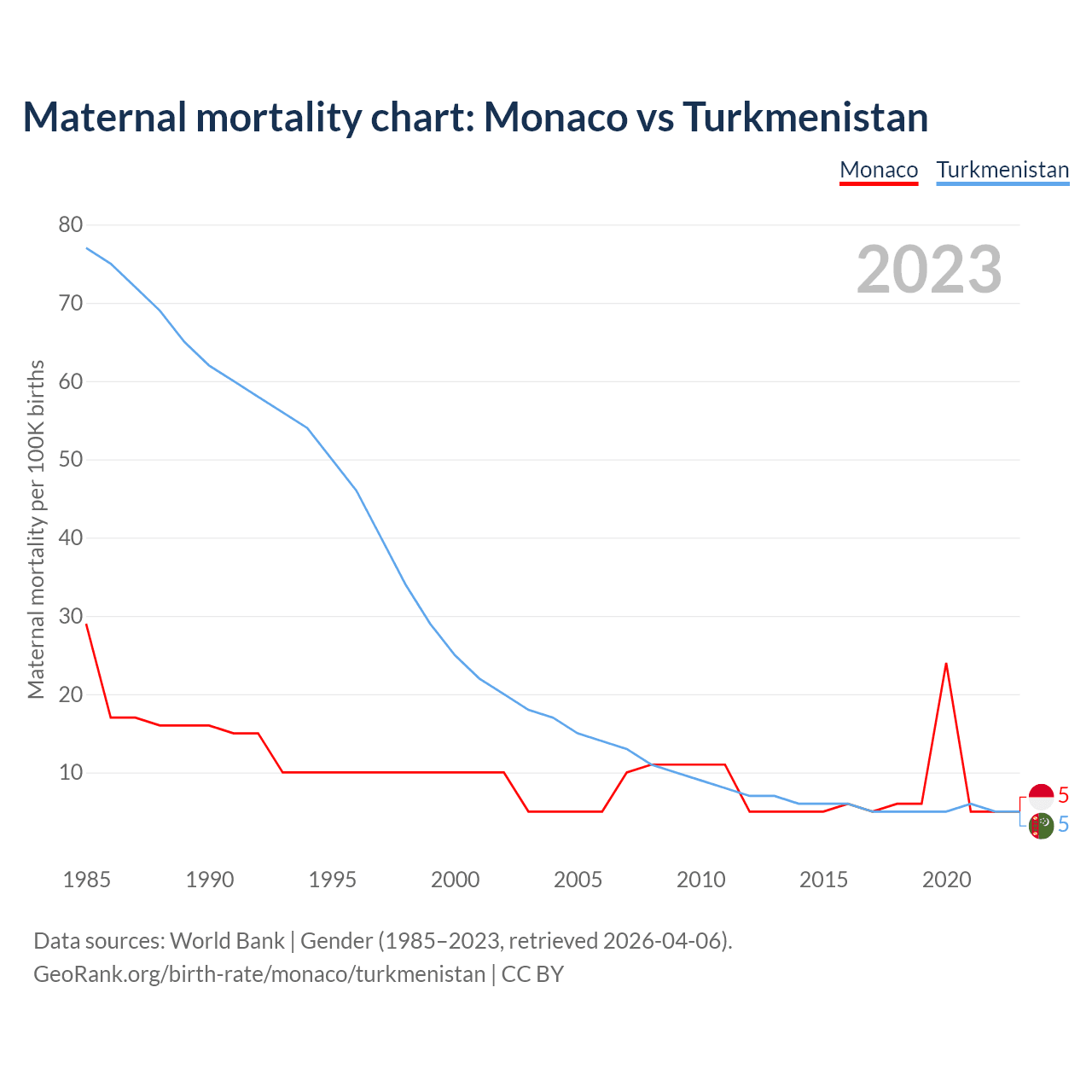 The maternal mortality rate, which is the probability of dying during childbirth or within 42 days of pregnancy termination, is 5 deaths per 100,000 live births in Monaco, compared to 5 deaths in Turkmenistan.