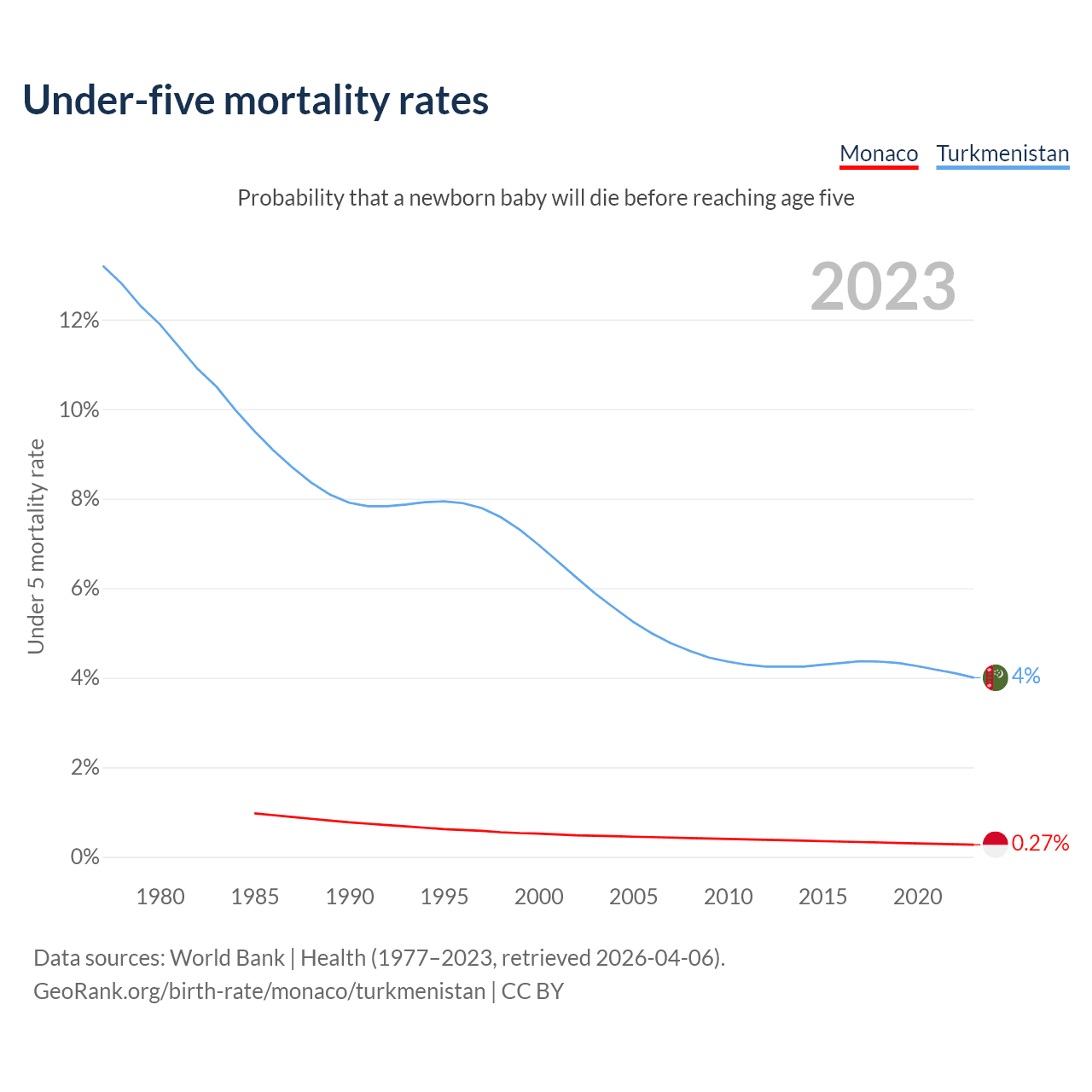 The chance that a newborn baby will die before reaching age five is 0.27% in Monaco and 4% in Turkmenistan. Above is a chart with historical data on under-five mortality rates.