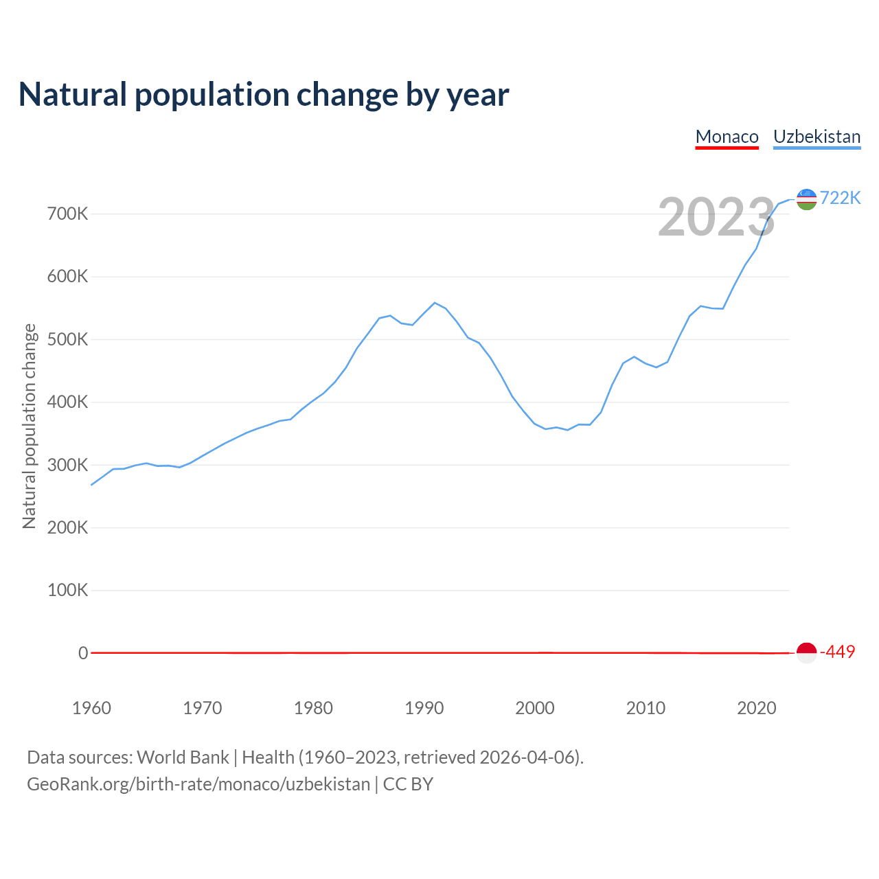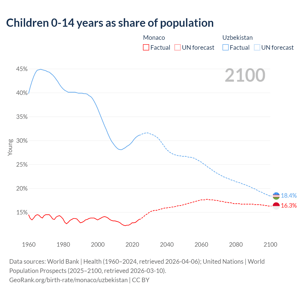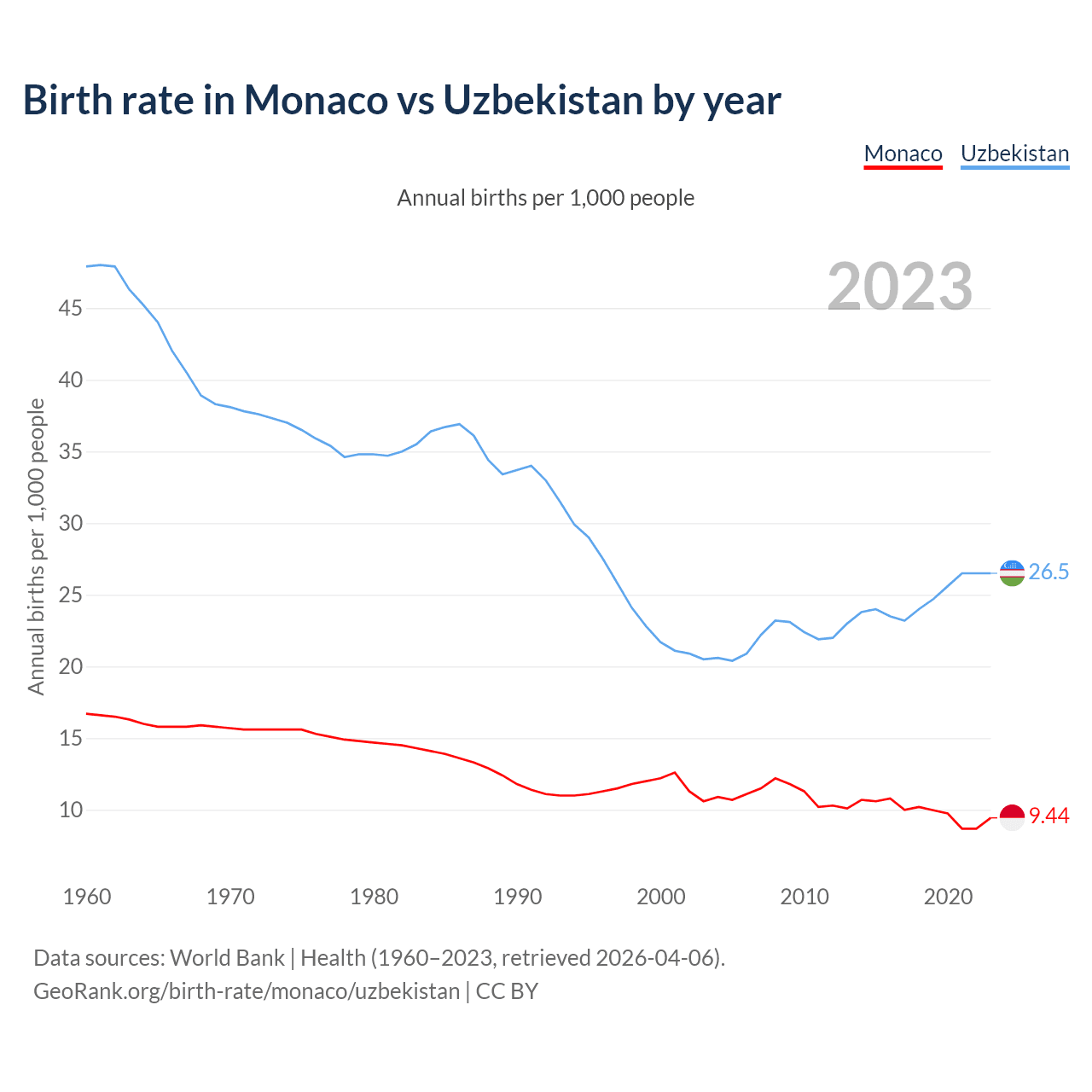 Monaco has an annual birth rate of 9.44 births per 1,000 people, compared to 26.5 for Uzbekistan. The average number of children a woman is expected to have during her lifetime — the fertility rate, is 2.11 in Monaco and 3.5 in Uzbekistan — 65.9% difference.