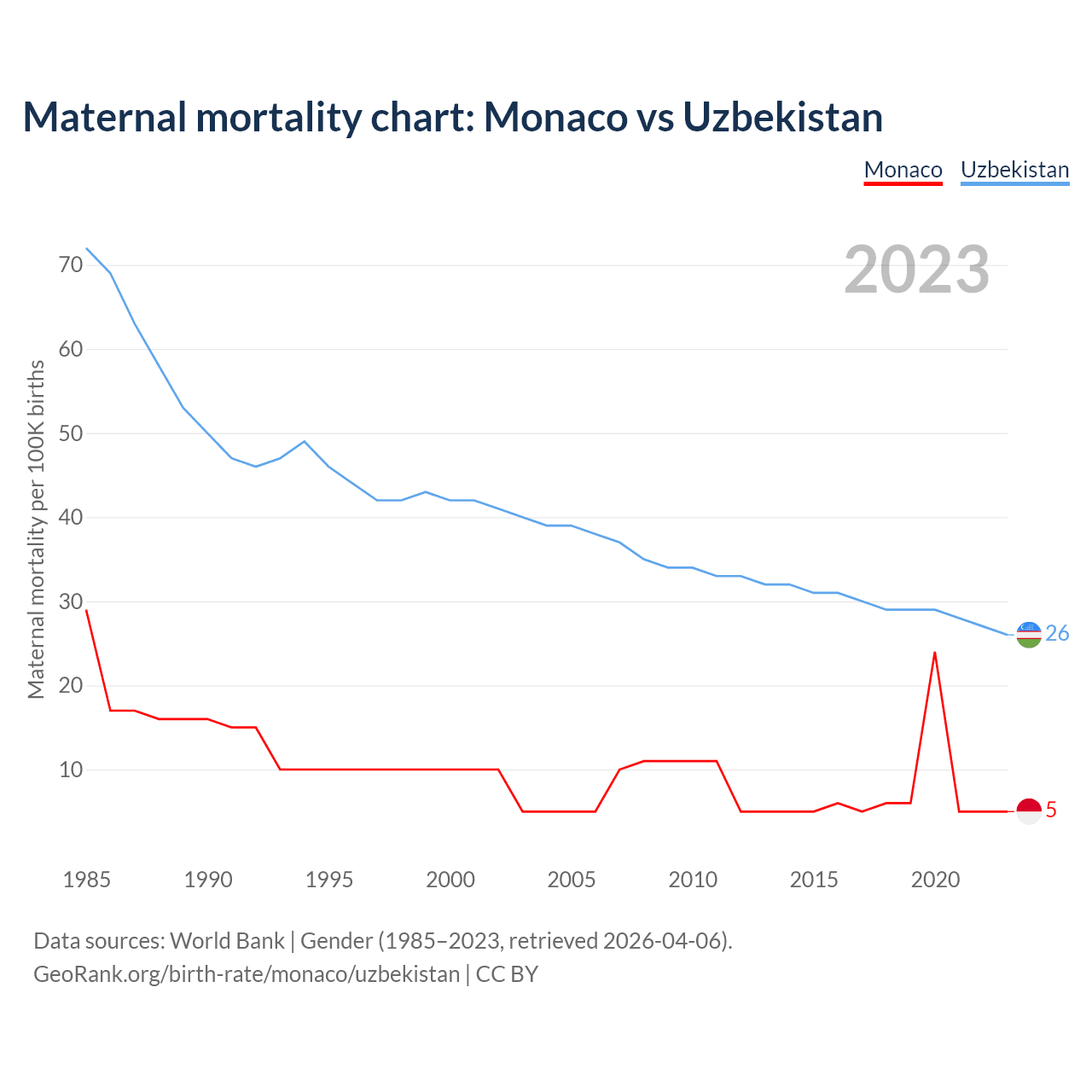The maternal mortality rate, which is the probability of dying during childbirth or within 42 days of pregnancy termination, is 5 deaths per 100,000 live births in Monaco, compared to 26 deaths in Uzbekistan.
