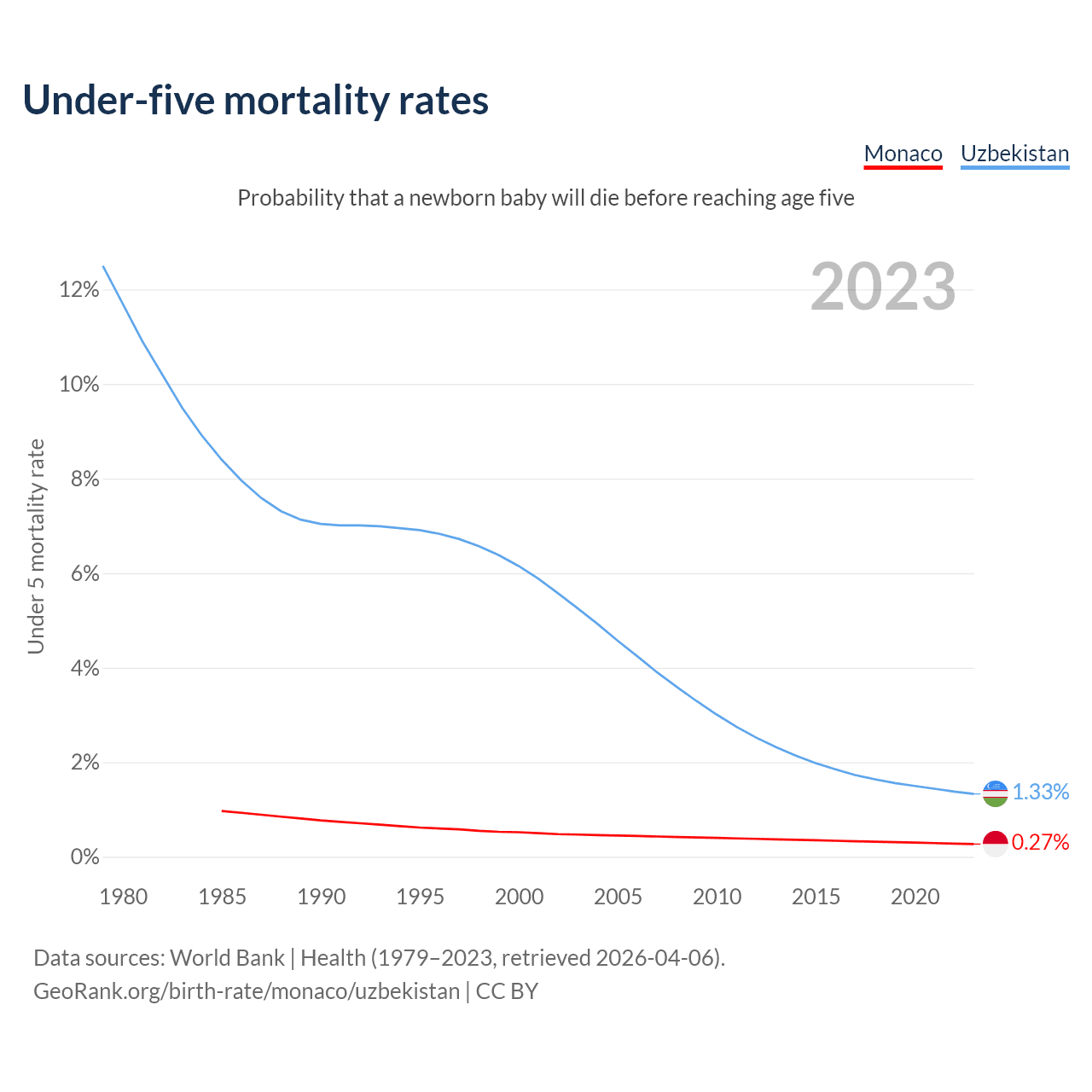 The chance that a newborn baby will die before reaching age five is 0.27% in Monaco and 1.33% in Uzbekistan. Above is a chart with historical data on under-five mortality rates.