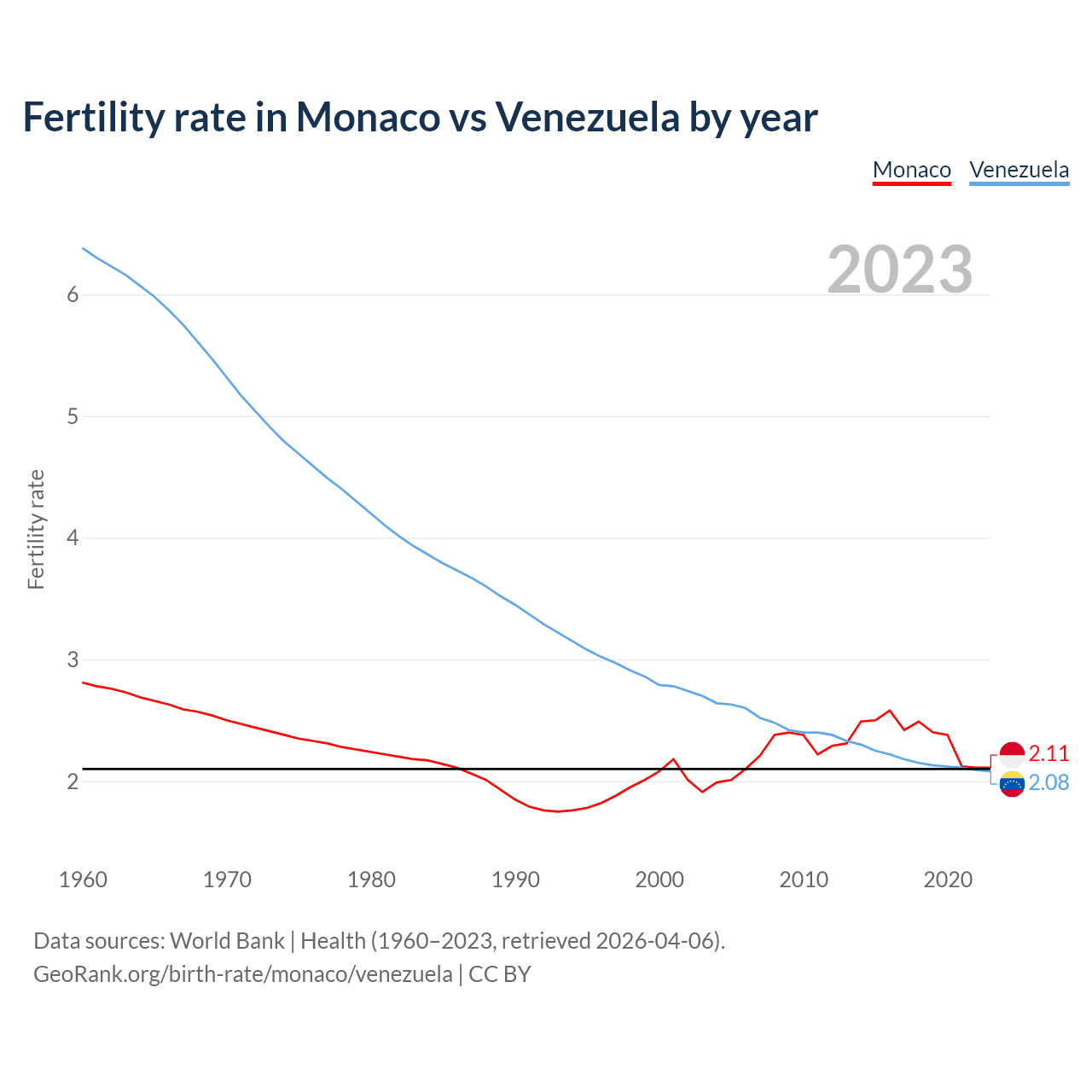 1960 vs 2023, the fertility rate has decreased by 25% in Monaco and by 67.4% in Venezuela — in 1960, it was 2.81 and 6.38, respectively.