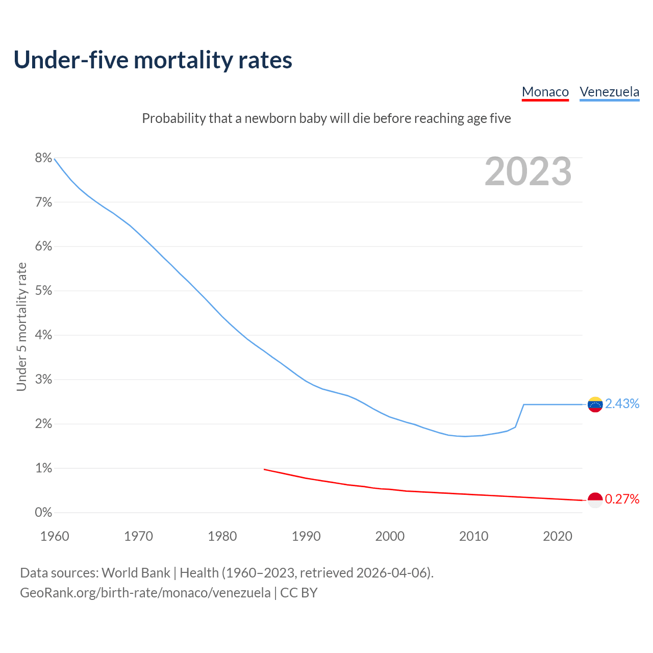 The chance that a newborn baby will die before reaching age five is 0.27% in Monaco and 2.43% in Venezuela. Above is a chart with historical data on under-five mortality rates.