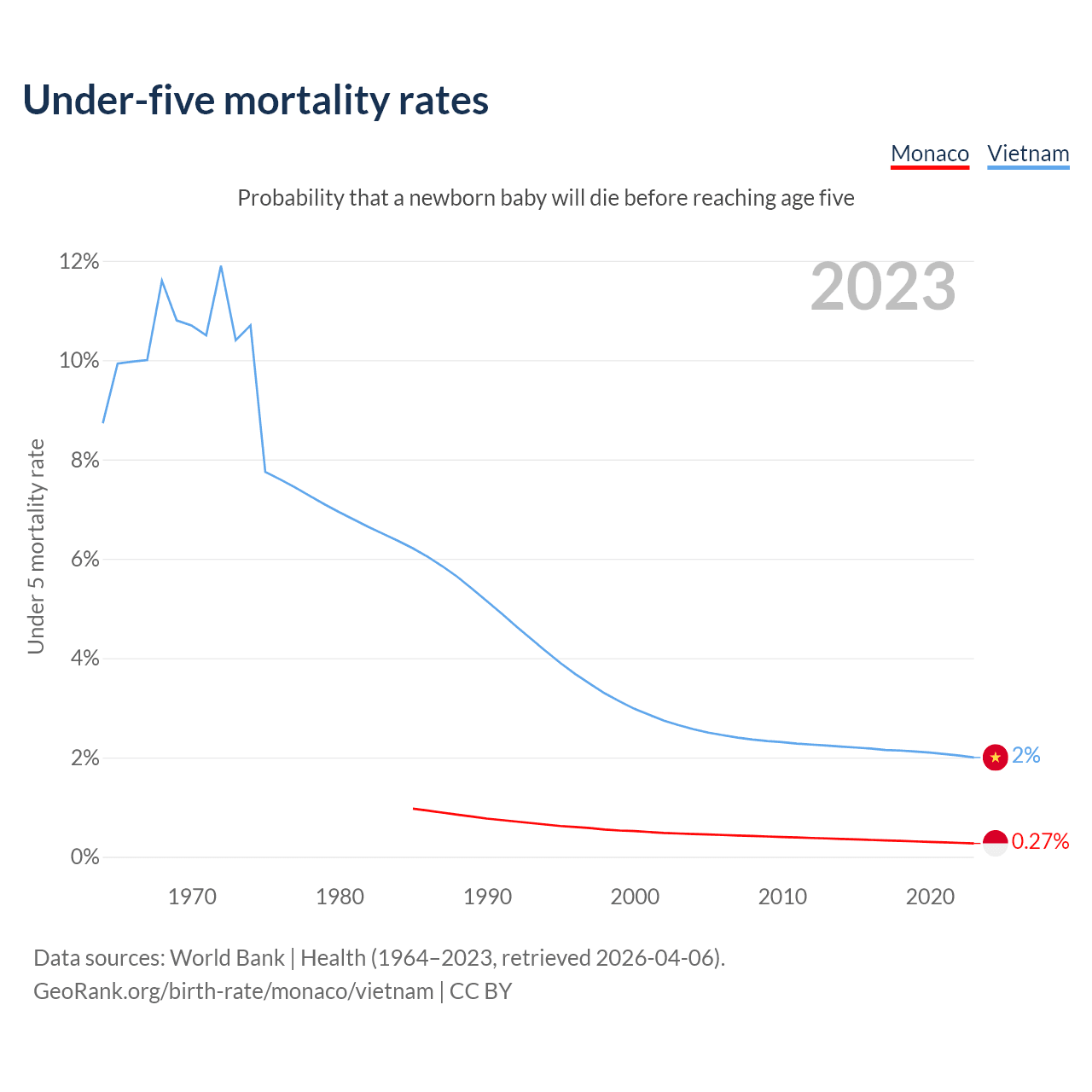 The chance that a newborn baby will die before reaching age five is 0.27% in Monaco and 2% in Vietnam. Above is a chart with historical data on under-five mortality rates.