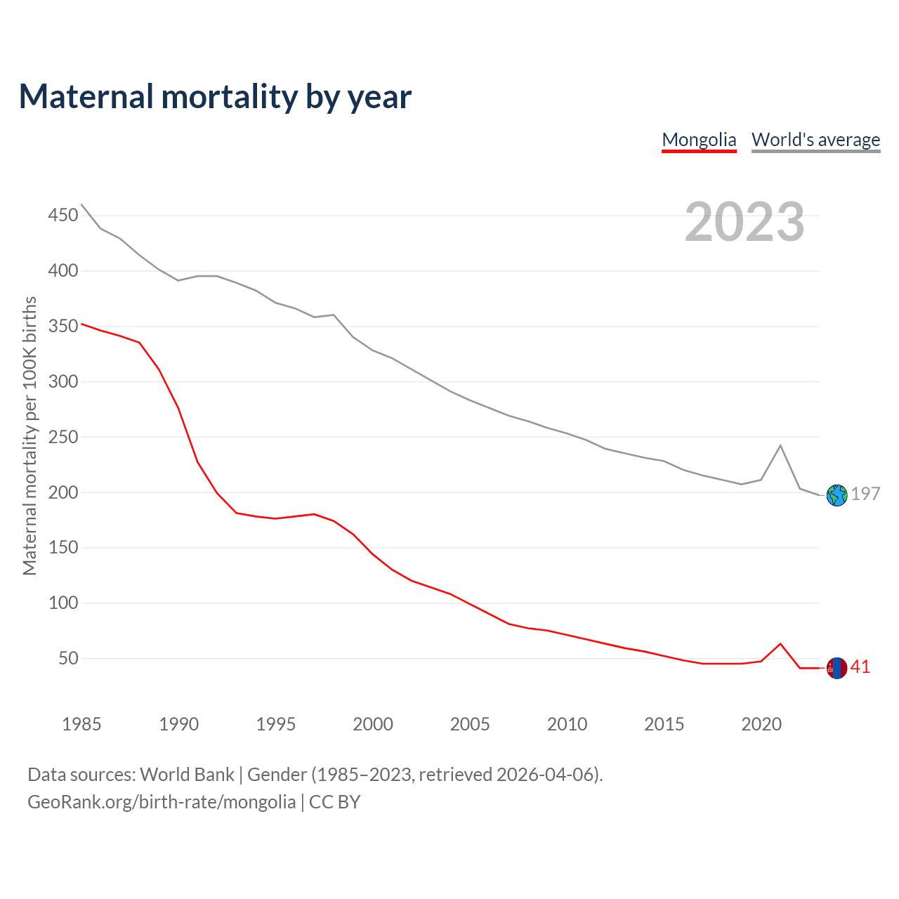 The maternal mortality rate in Mongolia was 41 deaths per 100,000 live births in 2023 — a 0.04% chance of dying during childbirth or within 42 days of pregnancy termination. This is a 71.5% decrease compared to the year 2000.