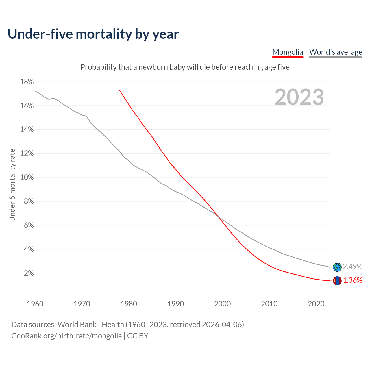 The under-5 mortality rate in Mongolia was 13.6 deaths per 1,000 live births in 2023 — a 1.36% chance that a newborn baby will die before reaching age five. This is down from 62.9 deaths per 1,000 live births in 2000.