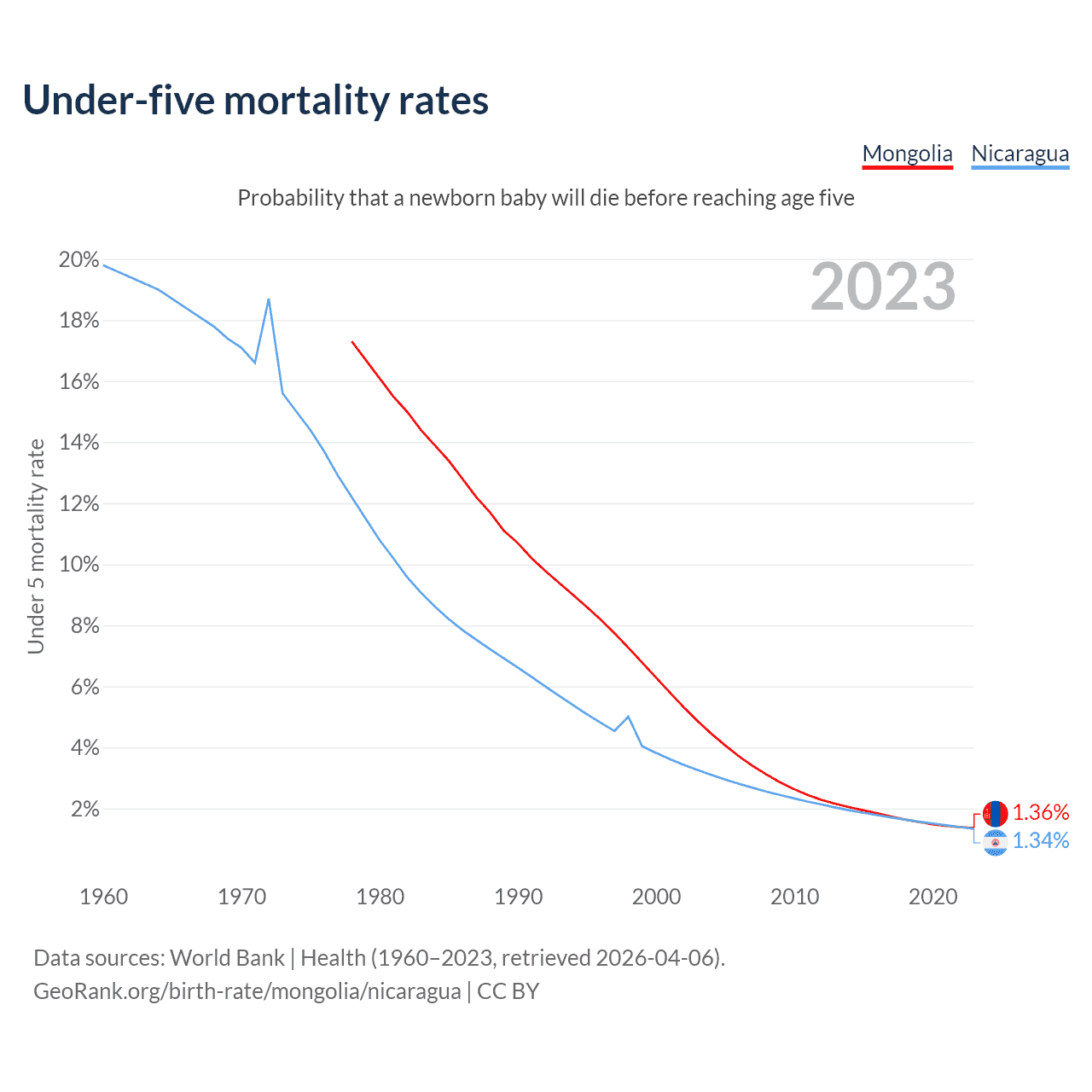The chance that a newborn baby will die before reaching age five is 1.36% in Mongolia and 1.34% in Nicaragua. Above is a chart with historical data on under-five mortality rates.