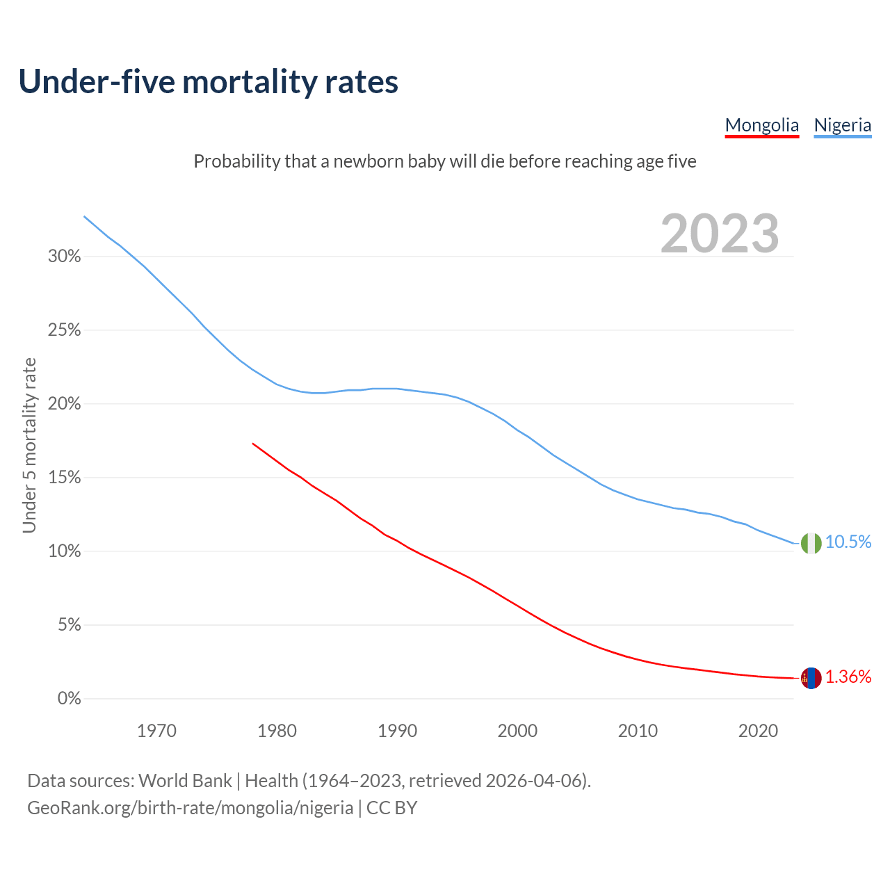 The chance that a newborn baby will die before reaching age five is 1.36% in Mongolia and 10.5% in Nigeria. Above is a chart with historical data on under-five mortality rates.