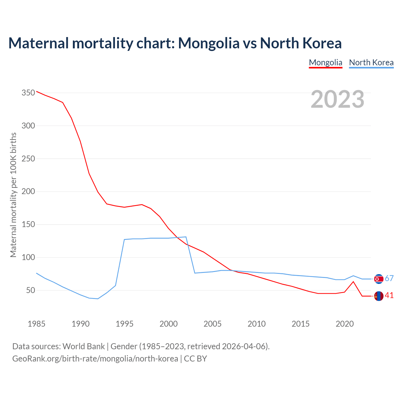The maternal mortality rate, which is the probability of dying during childbirth or within 42 days of pregnancy termination, is 41 deaths per 100,000 live births in Mongolia, compared to 67 deaths in North Korea.