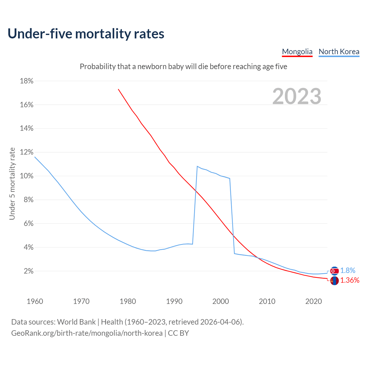 The chance that a newborn baby will die before reaching age five is 1.36% in Mongolia and 1.8% in North Korea. Above is a chart with historical data on under-five mortality rates.
