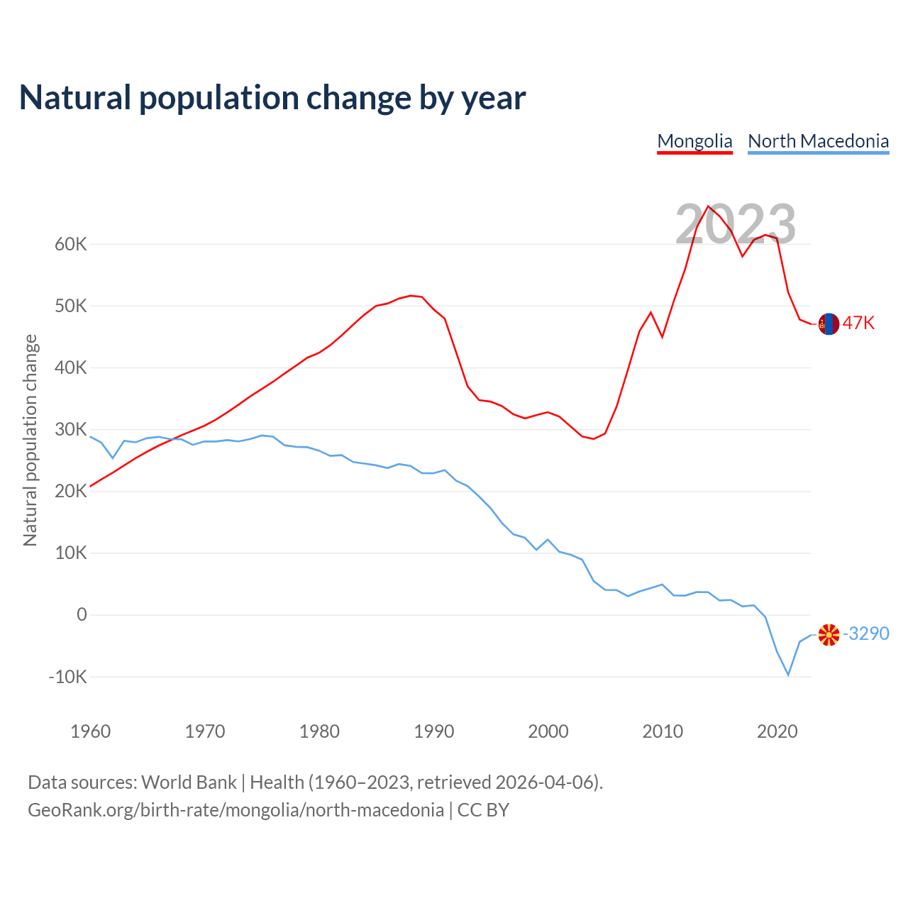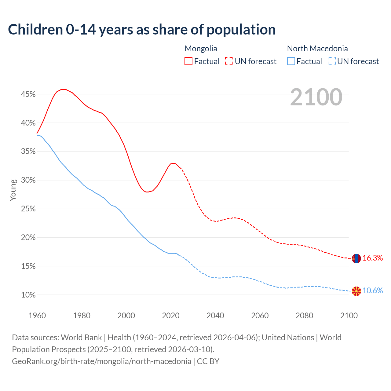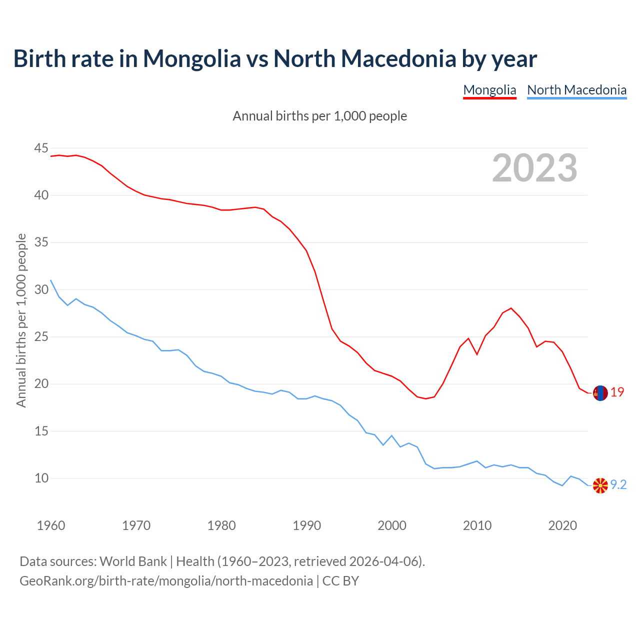 According to the latest available data on birth rates, the fertility rate in Mongolia was 2.7 children per woman in 2023, compared to 1.5 in North Macedonia in 2023. The replacement level is considered to be 2.1 children per woman.