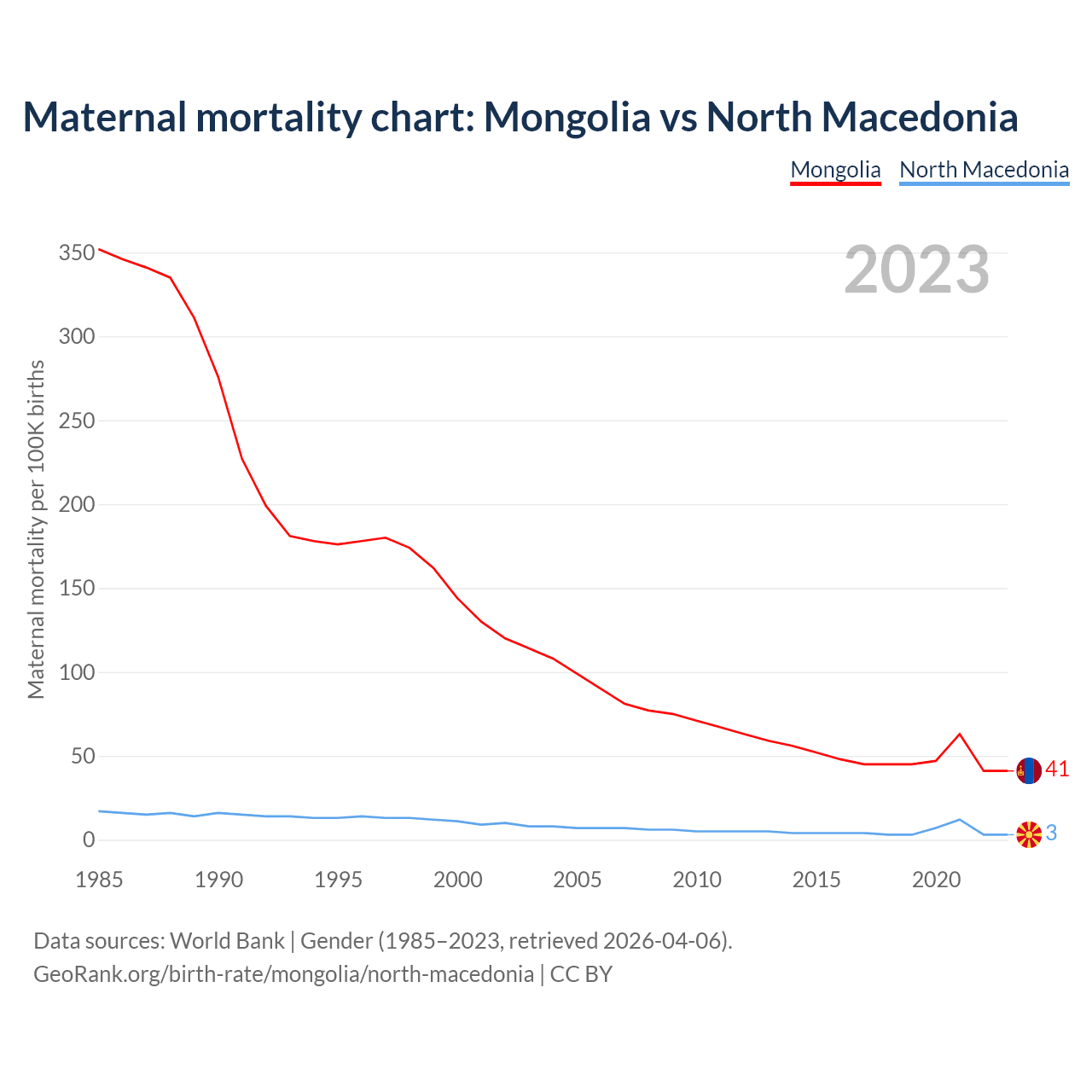 The maternal mortality rate, which is the probability of dying during childbirth or within 42 days of pregnancy termination, is 41 deaths per 100,000 live births in Mongolia, compared to 3 deaths in North Macedonia.