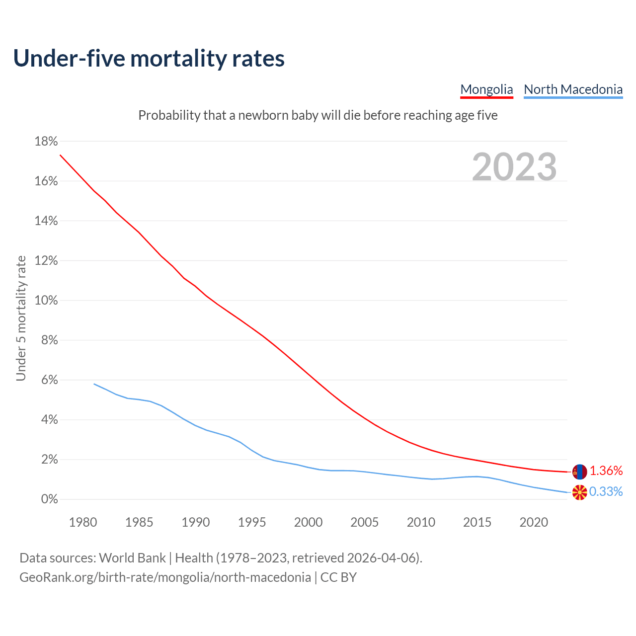 The chance that a newborn baby will die before reaching age five is 1.36% in Mongolia and 0.33% in North Macedonia. Above is a chart with historical data on under-five mortality rates.