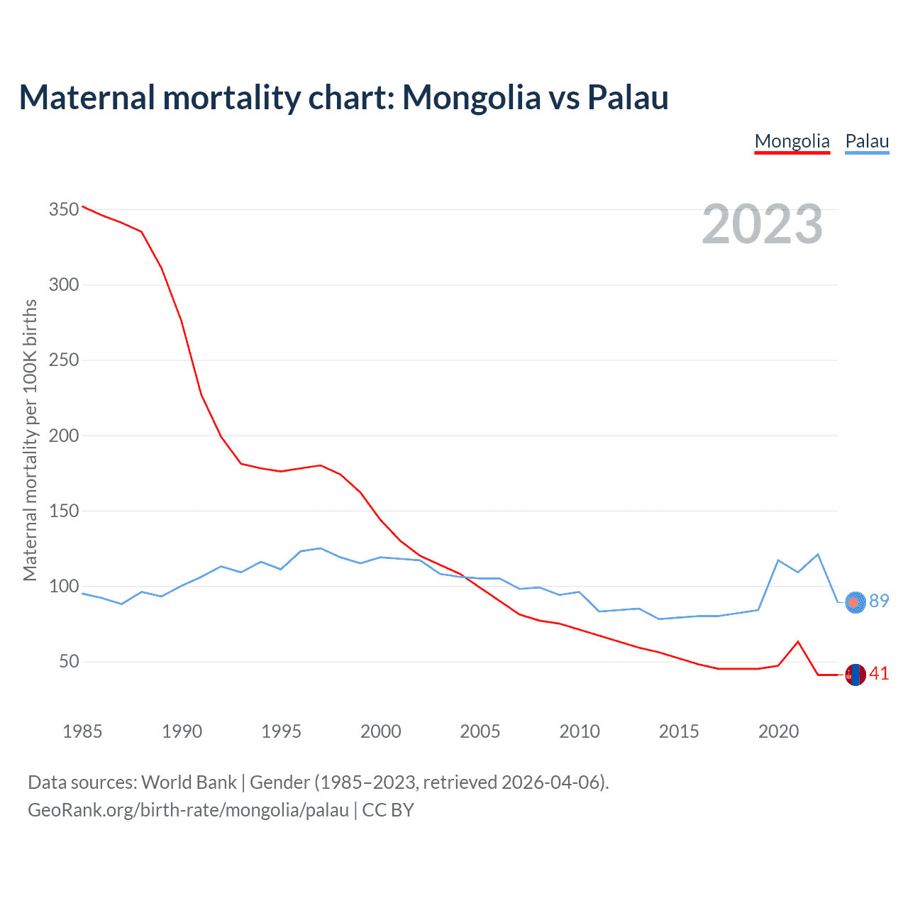 The maternal mortality rate, which is the probability of dying during childbirth or within 42 days of pregnancy termination, is 41 deaths per 100,000 live births in Mongolia, compared to 89 deaths in Palau.