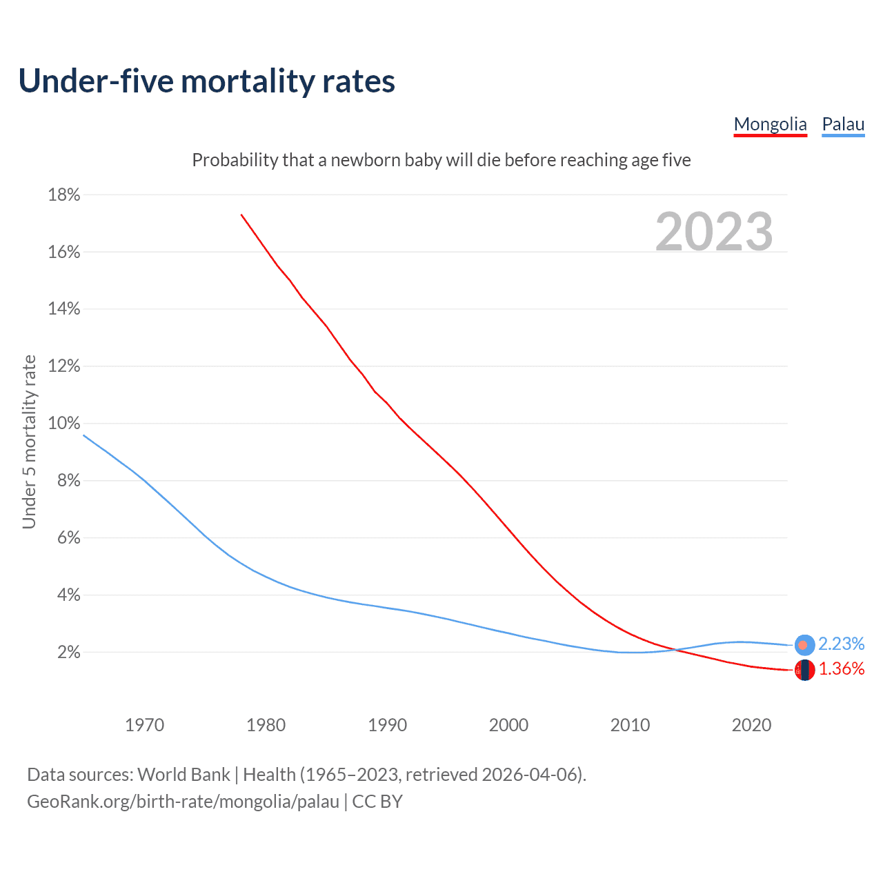The chance that a newborn baby will die before reaching age five is 1.36% in Mongolia and 2.23% in Palau. Above is a chart with historical data on under-five mortality rates.