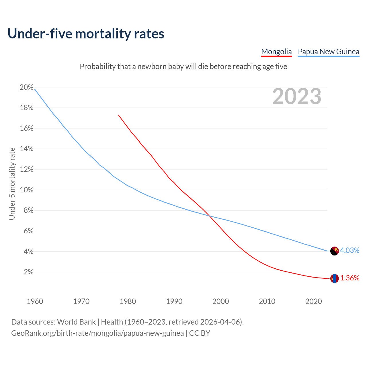 The chance that a newborn baby will die before reaching age five is 1.36% in Mongolia and 4.03% in Papua New Guinea. Above is a chart with historical data on under-five mortality rates.