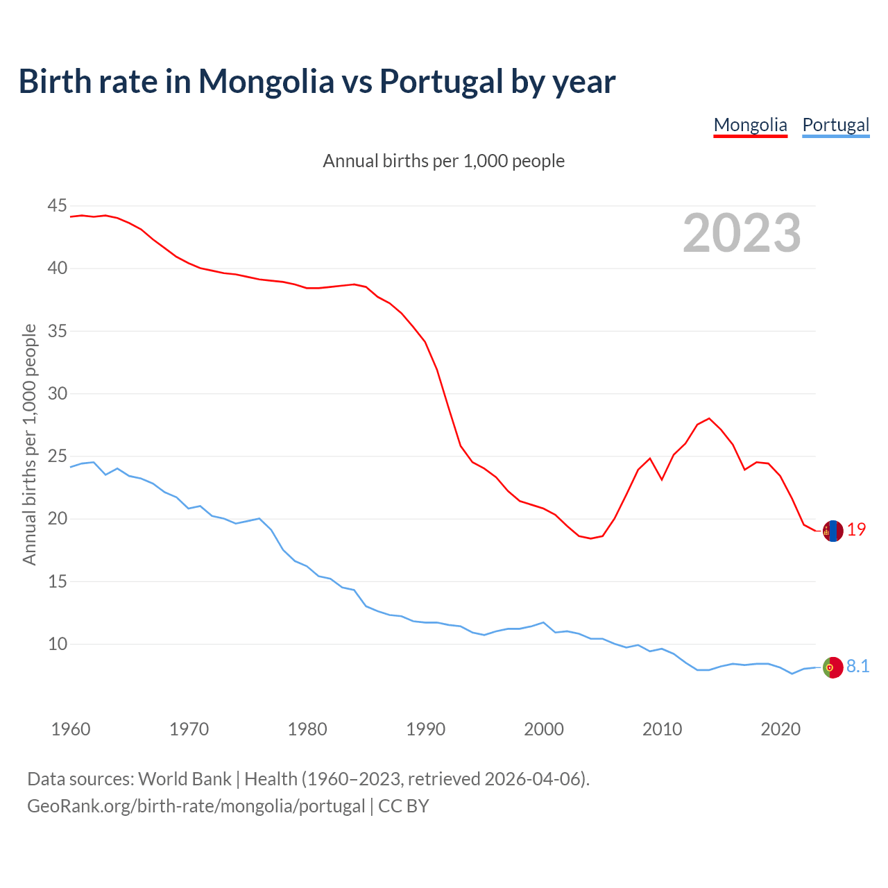 - Mongolia is ranked 81/196 by birth rate compared to 175/196 for Portugal.