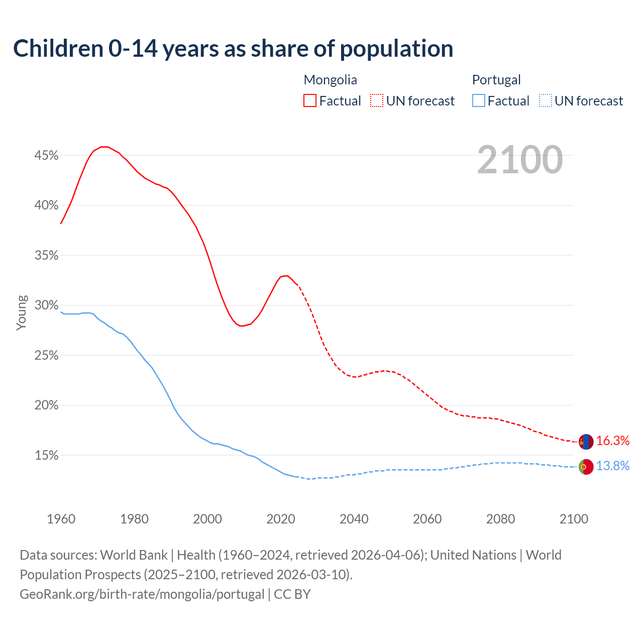 Mongolia has an annual birth rate of 19 births per 1,000 people, compared to 8.1 for Portugal. The average number of children a woman is expected to have during her lifetime — the fertility rate, is 2.7 in Mongolia and 1.44 in Portugal — 46.7% difference.