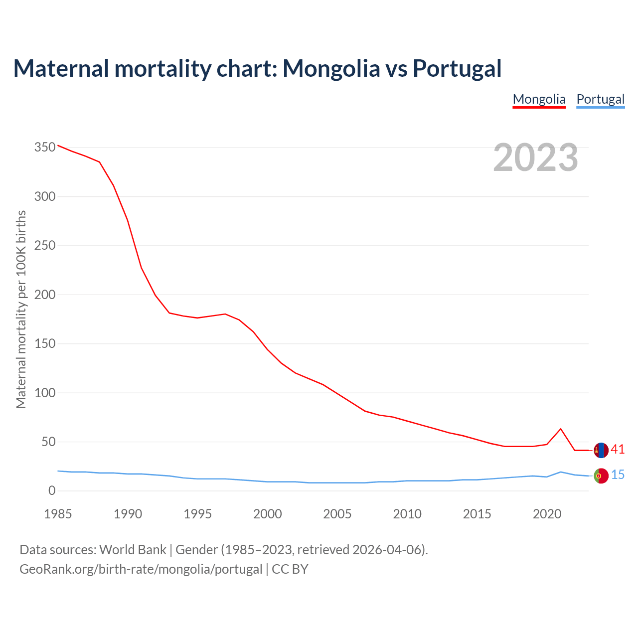 The maternal mortality rate, which is the probability of dying during childbirth or within 42 days of pregnancy termination, is 41 deaths per 100,000 live births in Mongolia, compared to 15 deaths in Portugal.