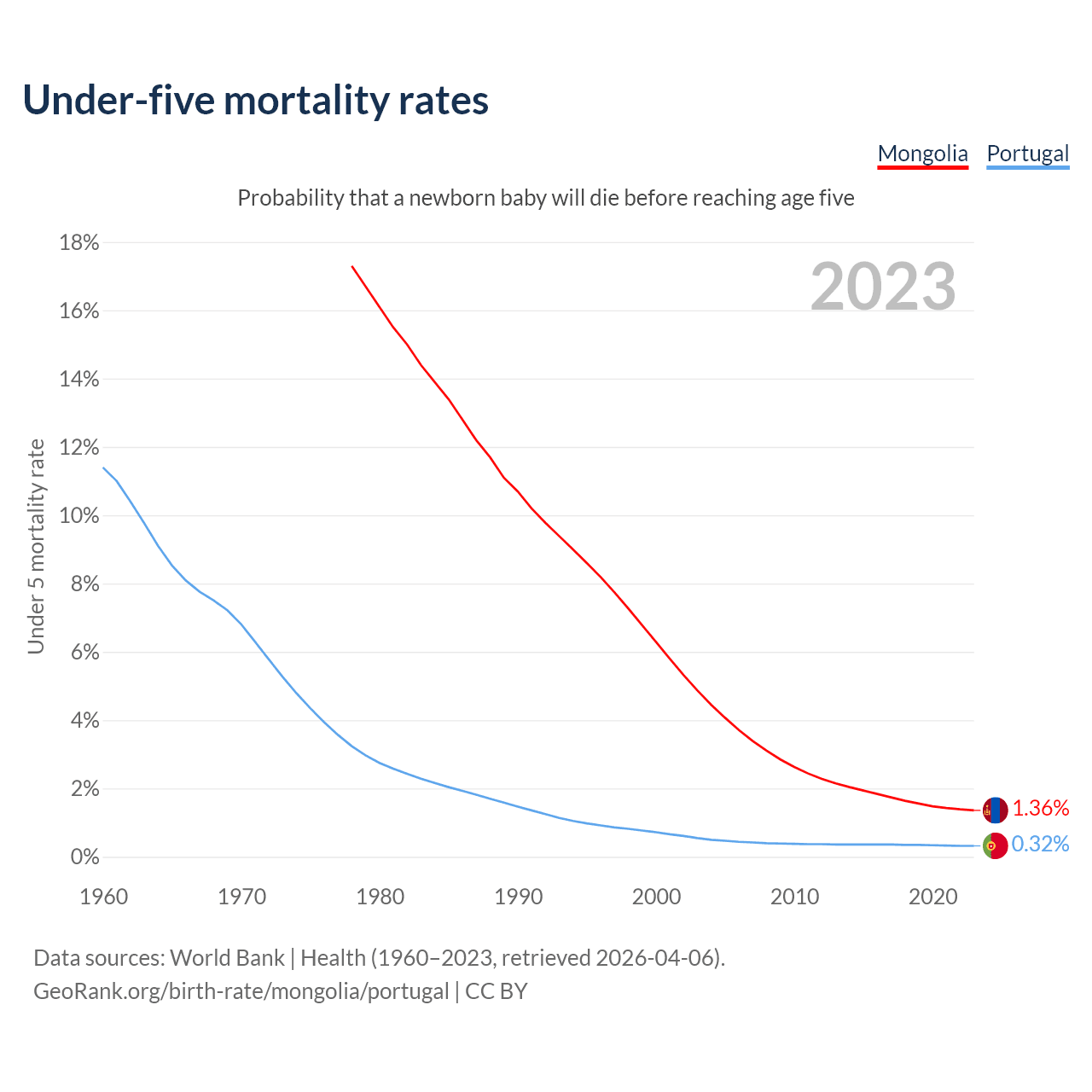 The chance that a newborn baby will die before reaching age five is 1.36% in Mongolia and 0.32% in Portugal. Above is a chart with historical data on under-five mortality rates.