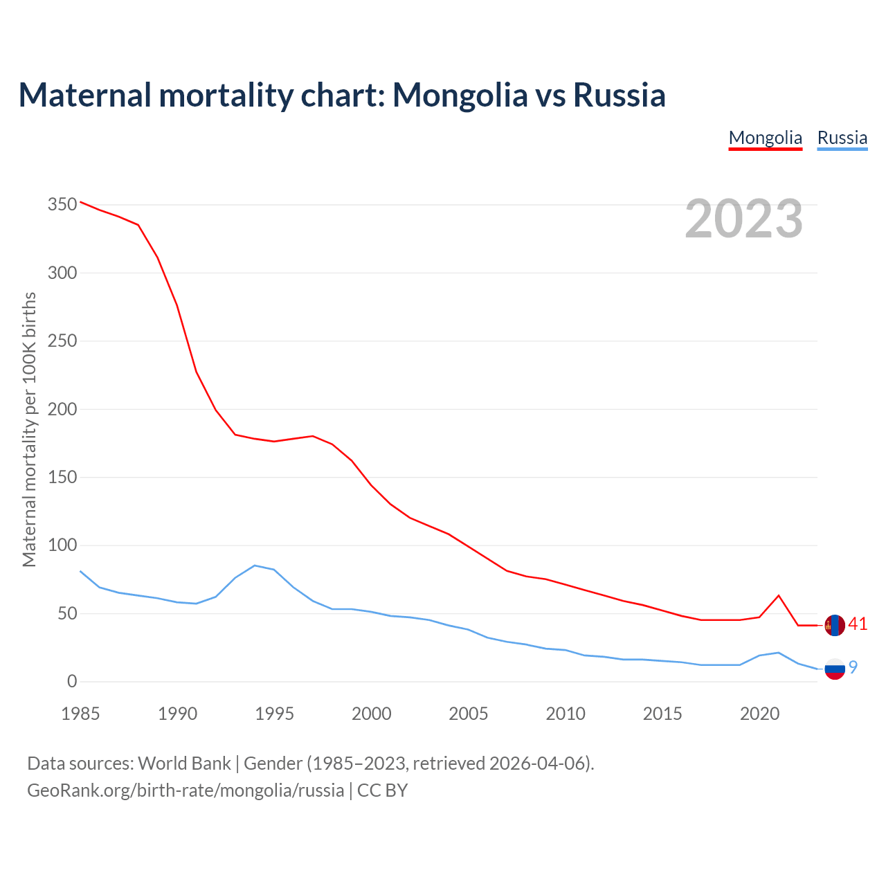 The maternal mortality rate, which is the probability of dying during childbirth or within 42 days of pregnancy termination, is 41 deaths per 100,000 live births in Mongolia, compared to 9 deaths in Russia.