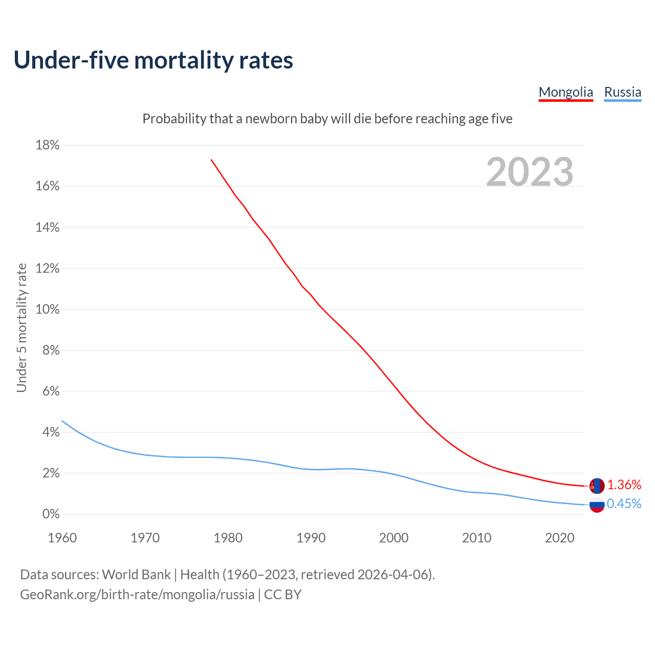 The chance that a newborn baby will die before reaching age five is 1.36% in Mongolia and 0.45% in Russia. Above is a chart with historical data on under-five mortality rates.
