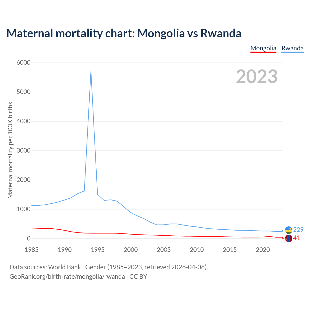 - Annual births per 1,000 women ages 15-19 (adolescent birth rate or teenage mother rate) is 19.7 in Mongolia vs 30.8 in Rwanda.