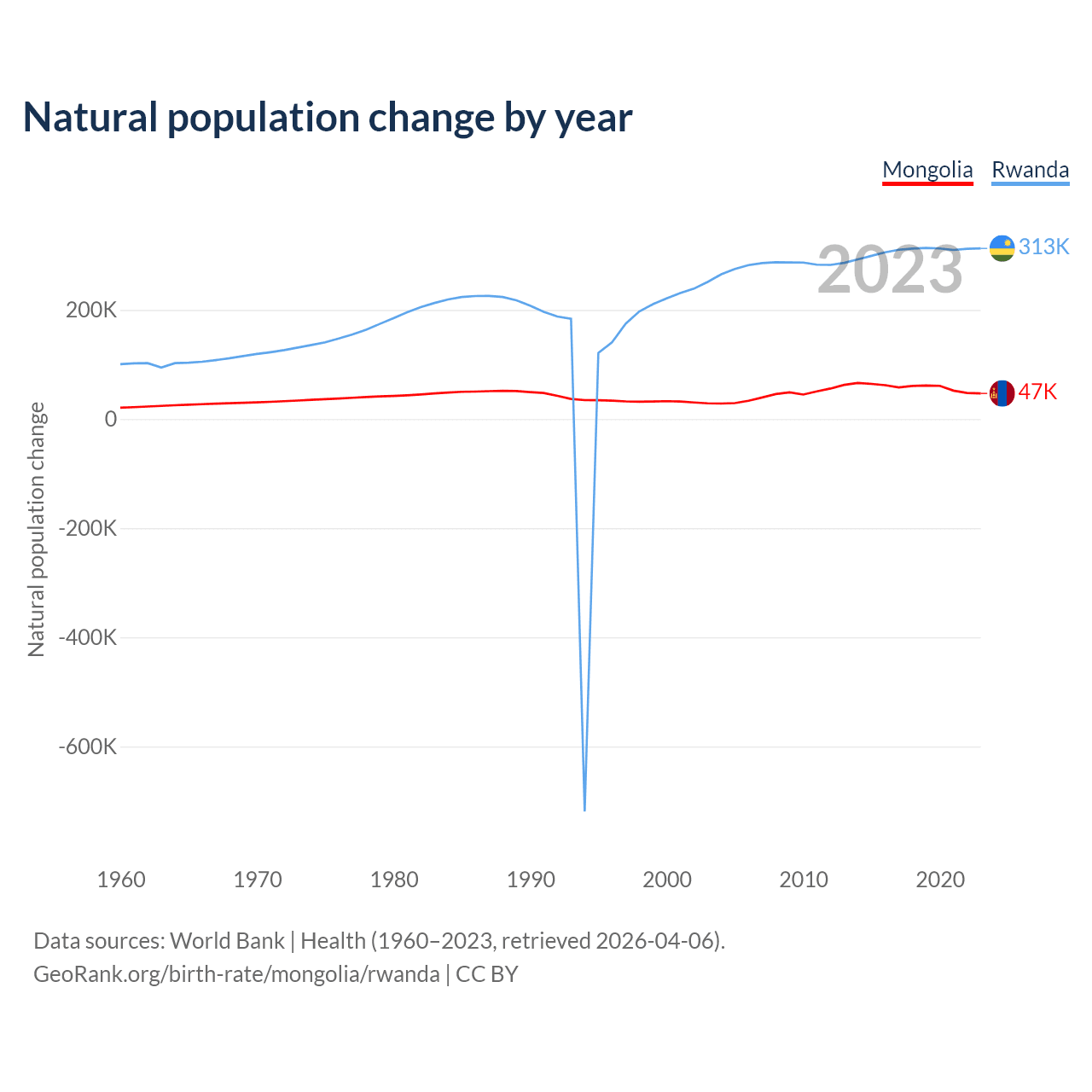 Mongolia has an annual birth rate of 19 births per 1,000 people, compared to 28.3 for Rwanda. The average number of children a woman is expected to have during her lifetime — the fertility rate, is 2.7 in Mongolia and 3.7 in Rwanda — 37% difference.