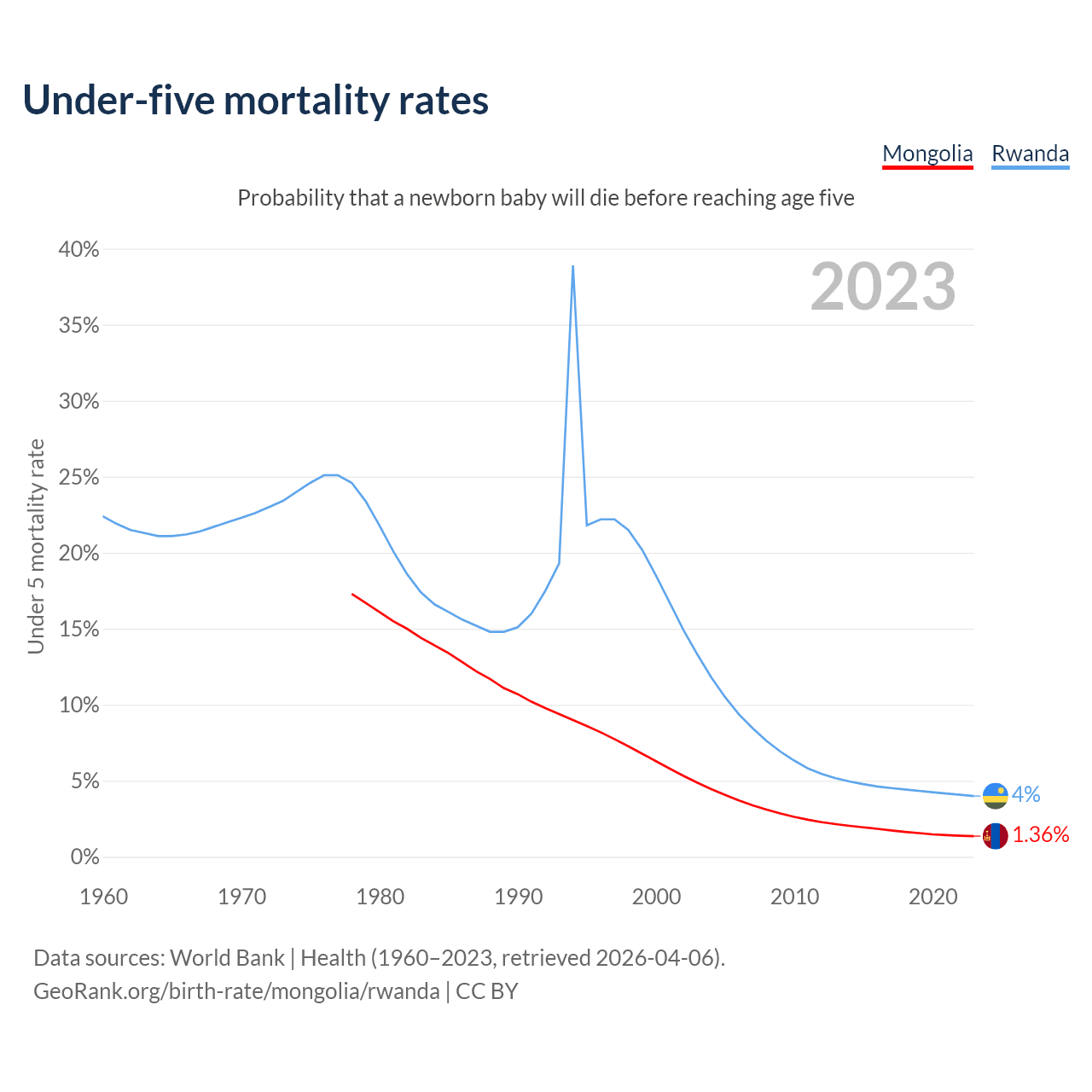 The chance that a newborn baby will die before reaching age five is 1.36% in Mongolia and 4% in Rwanda. Above is a chart with historical data on under-five mortality rates.