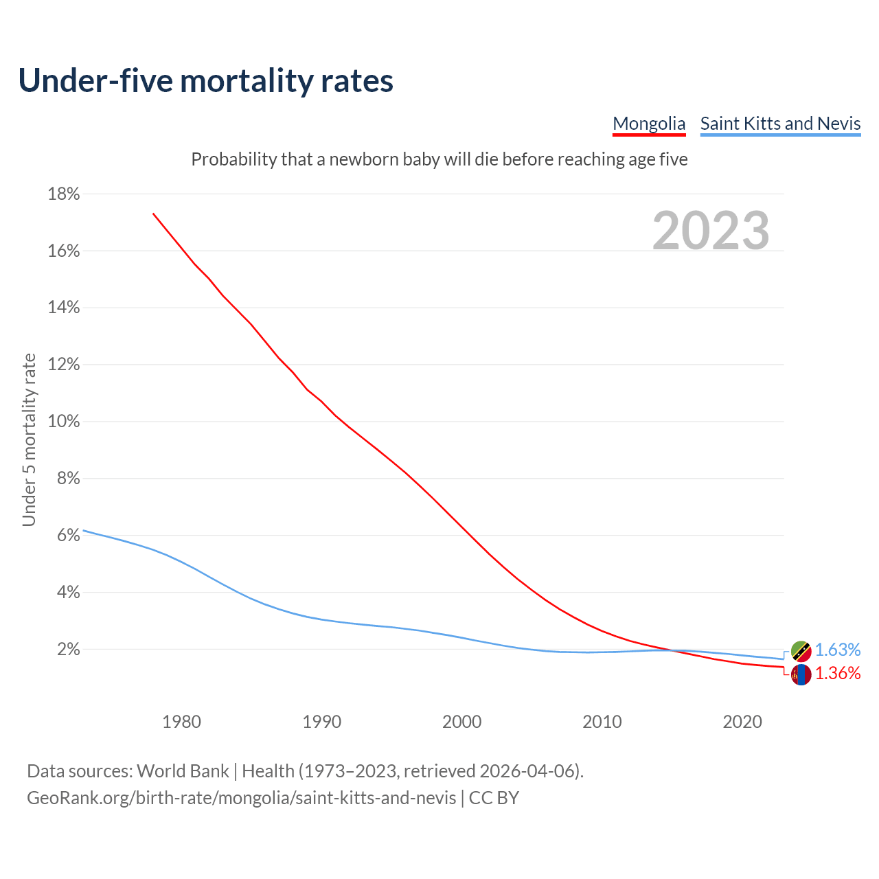 The chance that a newborn baby will die before reaching age five is 1.36% in Mongolia and 1.63% in Saint Kitts and Nevis. Above is a chart with historical data on under-five mortality rates.