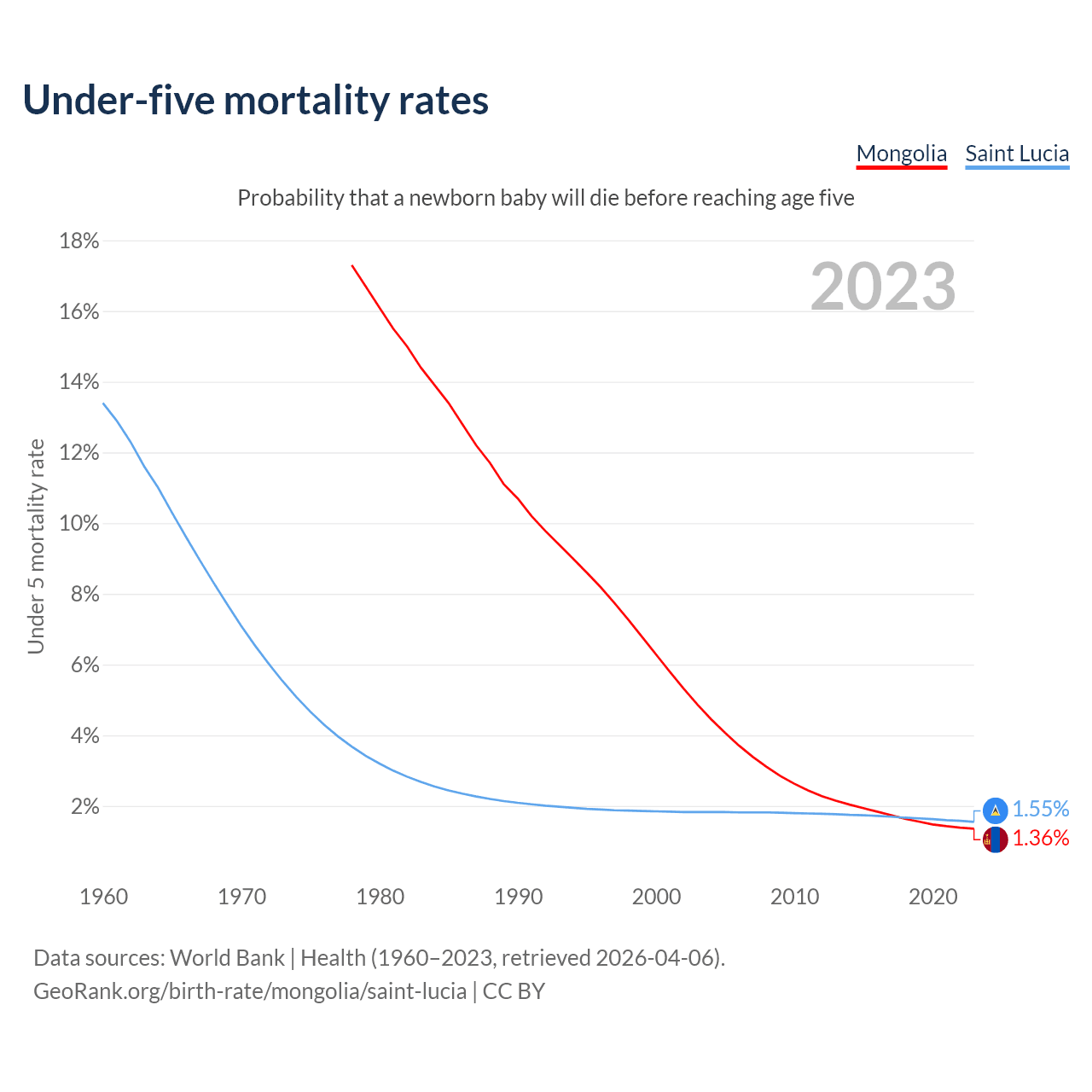 The chance that a newborn baby will die before reaching age five is 1.36% in Mongolia and 1.55% in Saint Lucia. Above is a chart with historical data on under-five mortality rates.