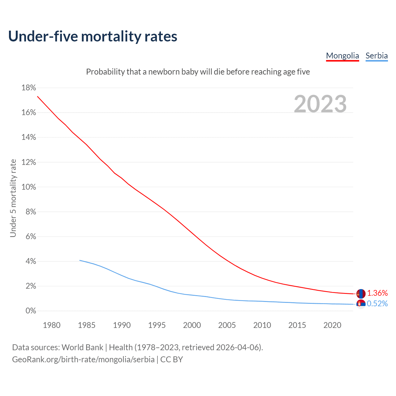 The chance that a newborn baby will die before reaching age five is 1.36% in Mongolia and 0.52% in Serbia. Above is a chart with historical data on under-five mortality rates.