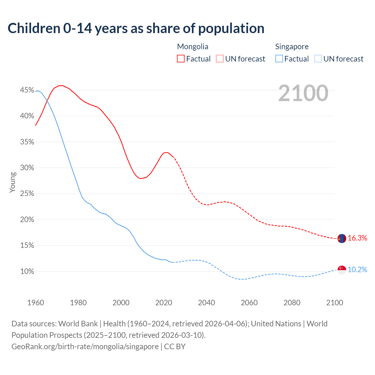 According to the latest available data on birth rates, the fertility rate in Mongolia was 2.7 children per woman in 2023, compared to 0.97 in Singapore in 2023. The replacement level is considered to be 2.1 children per woman.
