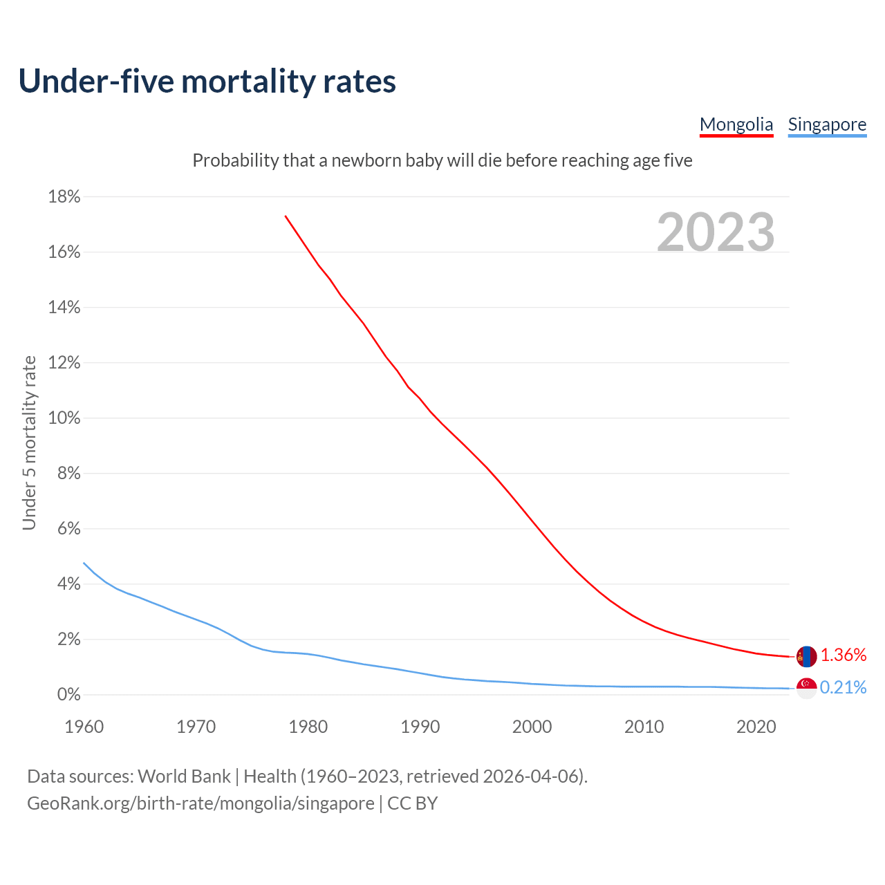 The chance that a newborn baby will die before reaching age five is 1.36% in Mongolia and 0.21% in Singapore. Above is a chart with historical data on under-five mortality rates.