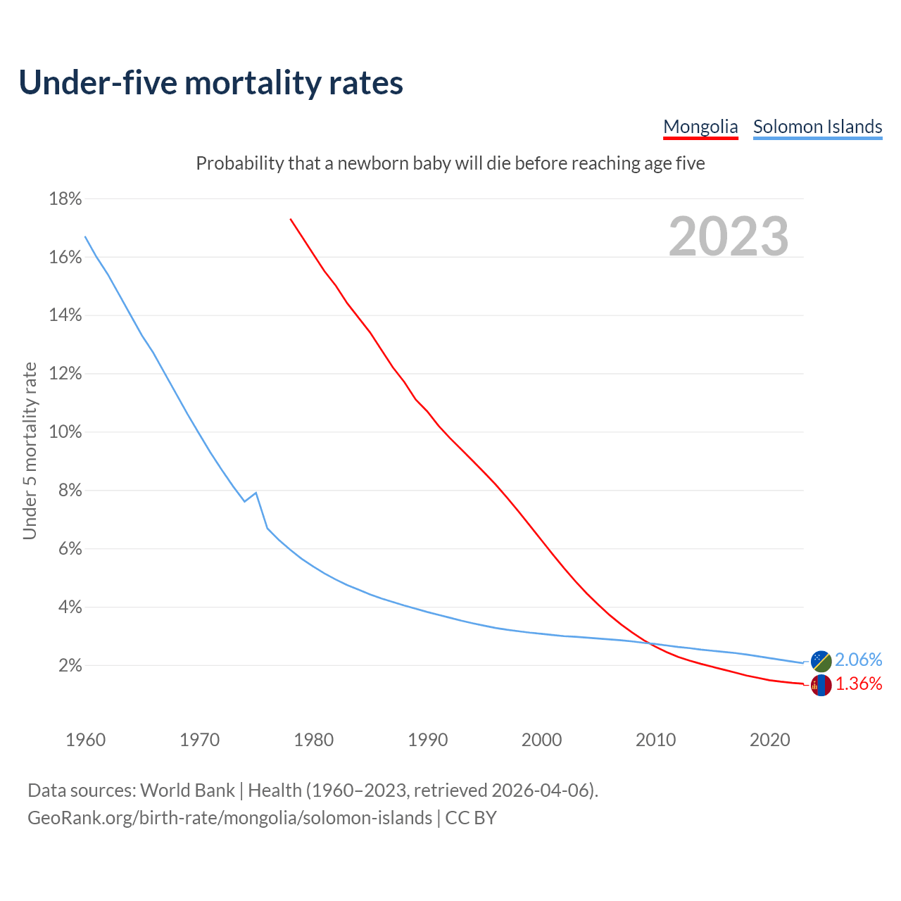 The chance that a newborn baby will die before reaching age five is 1.36% in Mongolia and 2.06% in the Solomon Islands. Above is a chart with historical data on under-five mortality rates.