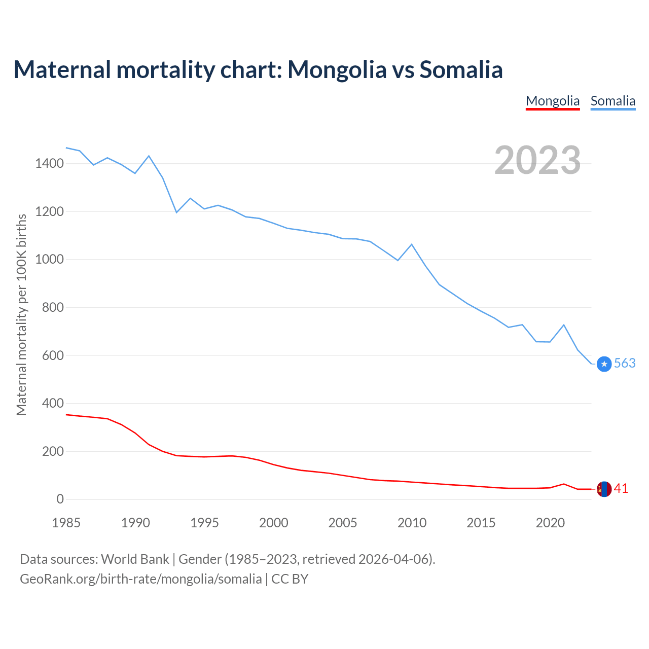 The maternal mortality rate, which is the probability of dying during childbirth or within 42 days of pregnancy termination, is 41 deaths per 100,000 live births in Mongolia, compared to 563 deaths in Somalia.