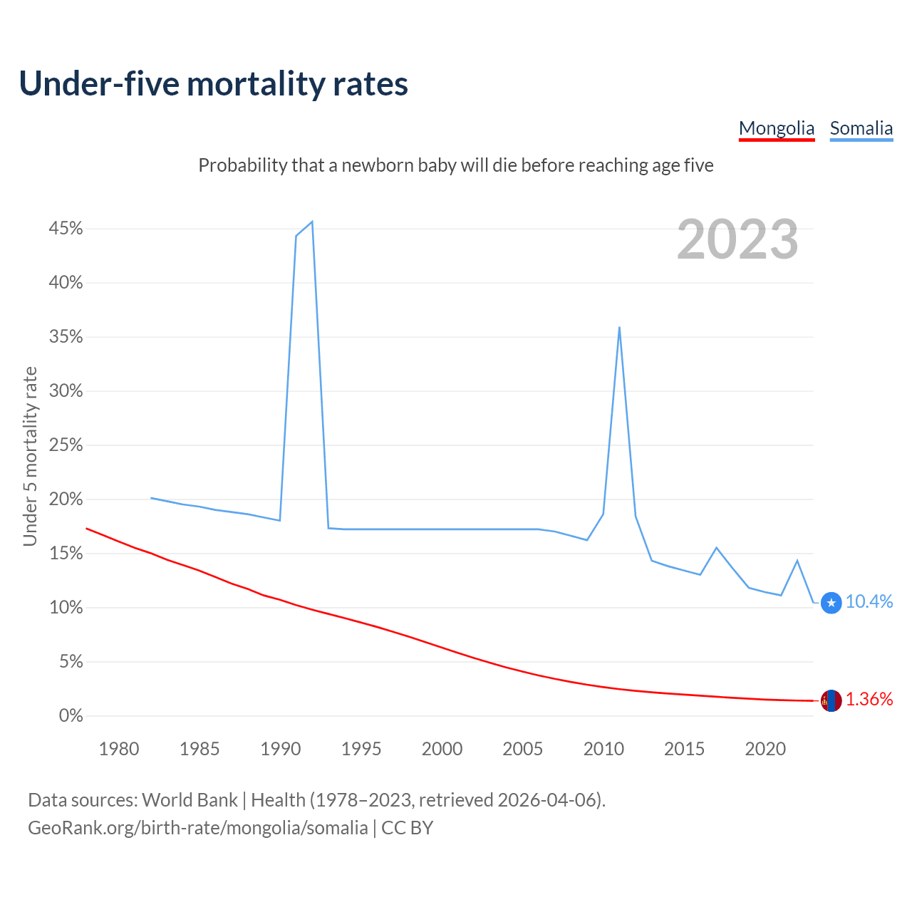 The chance that a newborn baby will die before reaching age five is 1.36% in Mongolia and 10.4% in Somalia. Above is a chart with historical data on under-five mortality rates.