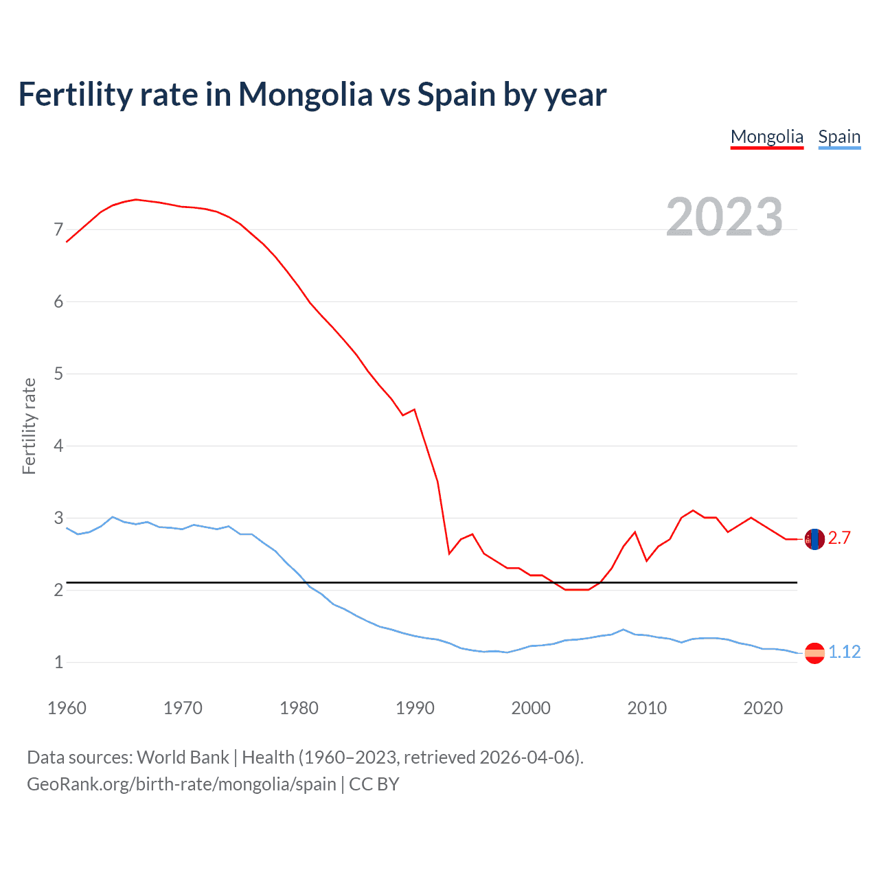 1960 vs 2023, the fertility rate has decreased by 60.4% in Mongolia and by 60.8% in Spain — in 1960, it was 6.82 and 2.86, respectively.