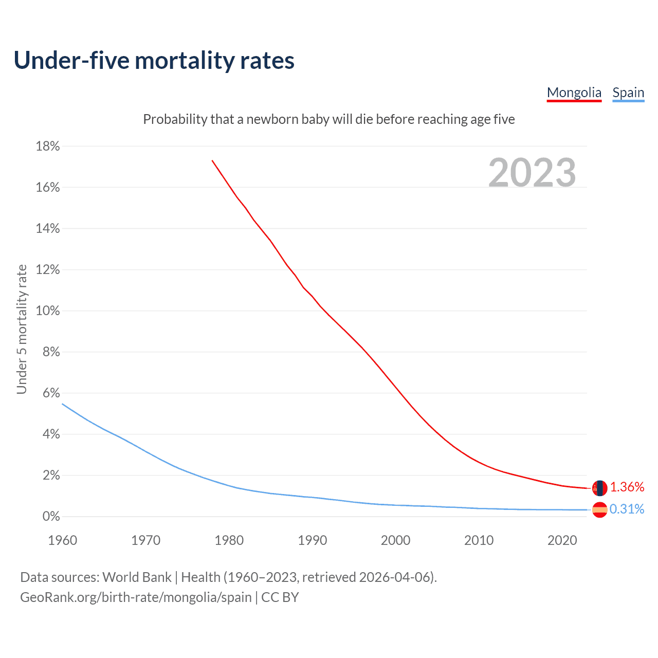 The chance that a newborn baby will die before reaching age five is 1.36% in Mongolia and 0.31% in Spain. Above is a chart with historical data on under-five mortality rates.