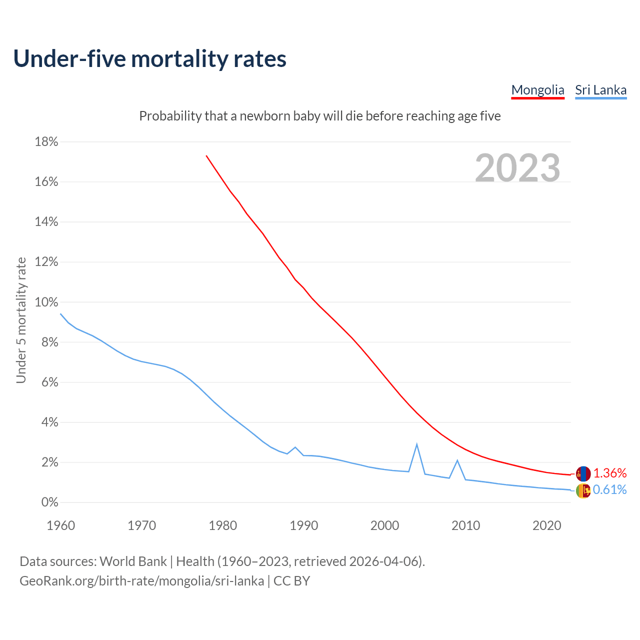 The chance that a newborn baby will die before reaching age five is 1.36% in Mongolia and 0.61% in Sri Lanka. Above is a chart with historical data on under-five mortality rates.