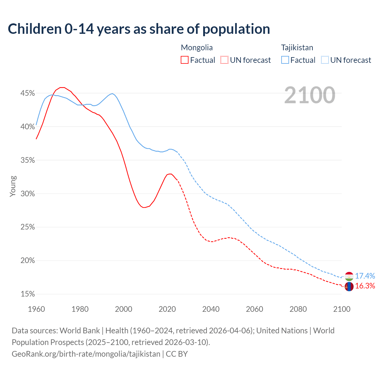 According to the latest available data on birth rates, the fertility rate in Mongolia was 2.7 children per woman in 2023, compared to 3.07 in Tajikistan in 2023. The replacement level is considered to be 2.1 children per woman.